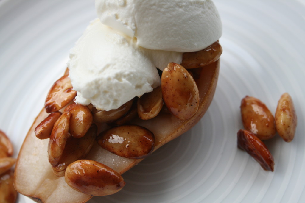 Candied Almonds on Roasted Pears