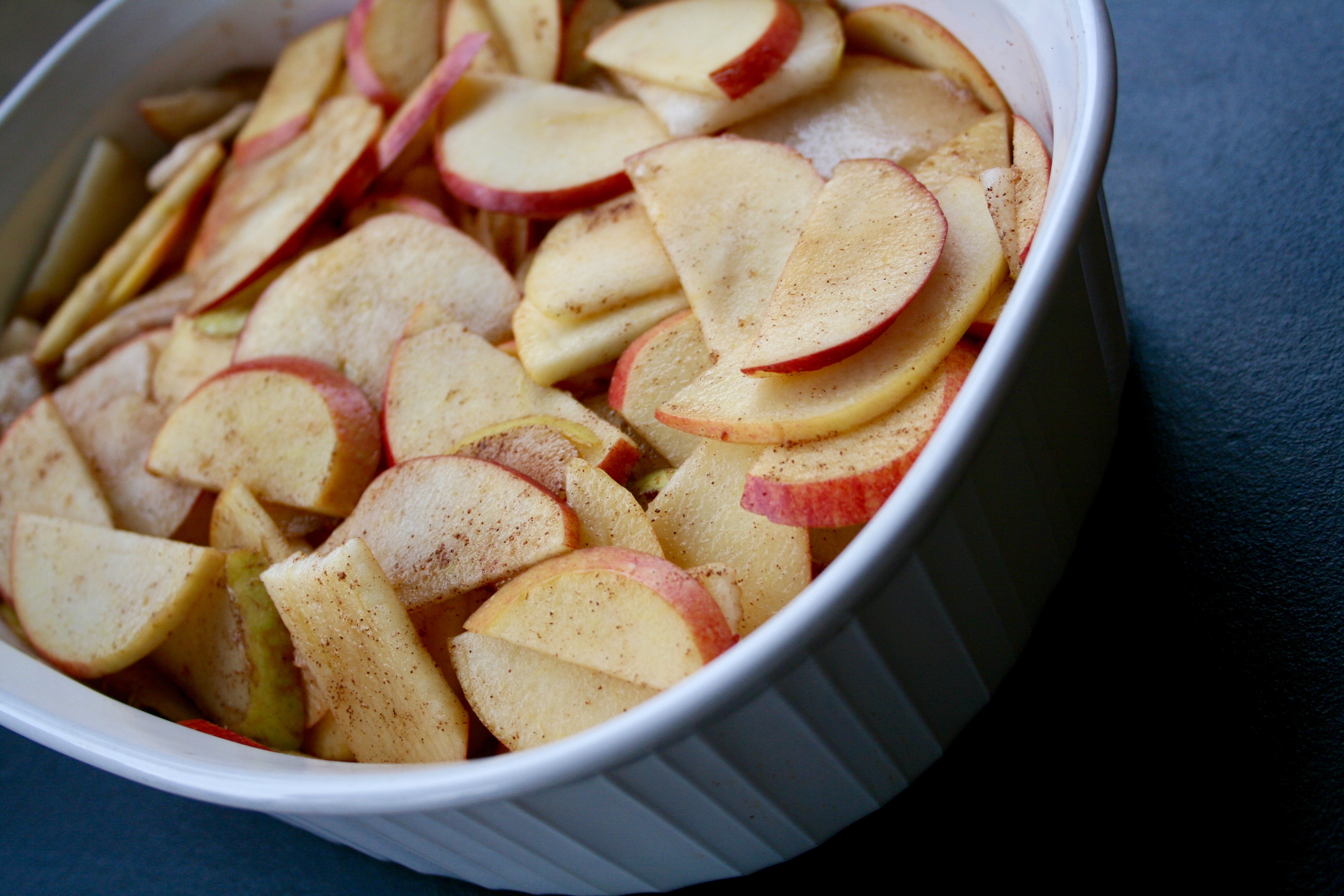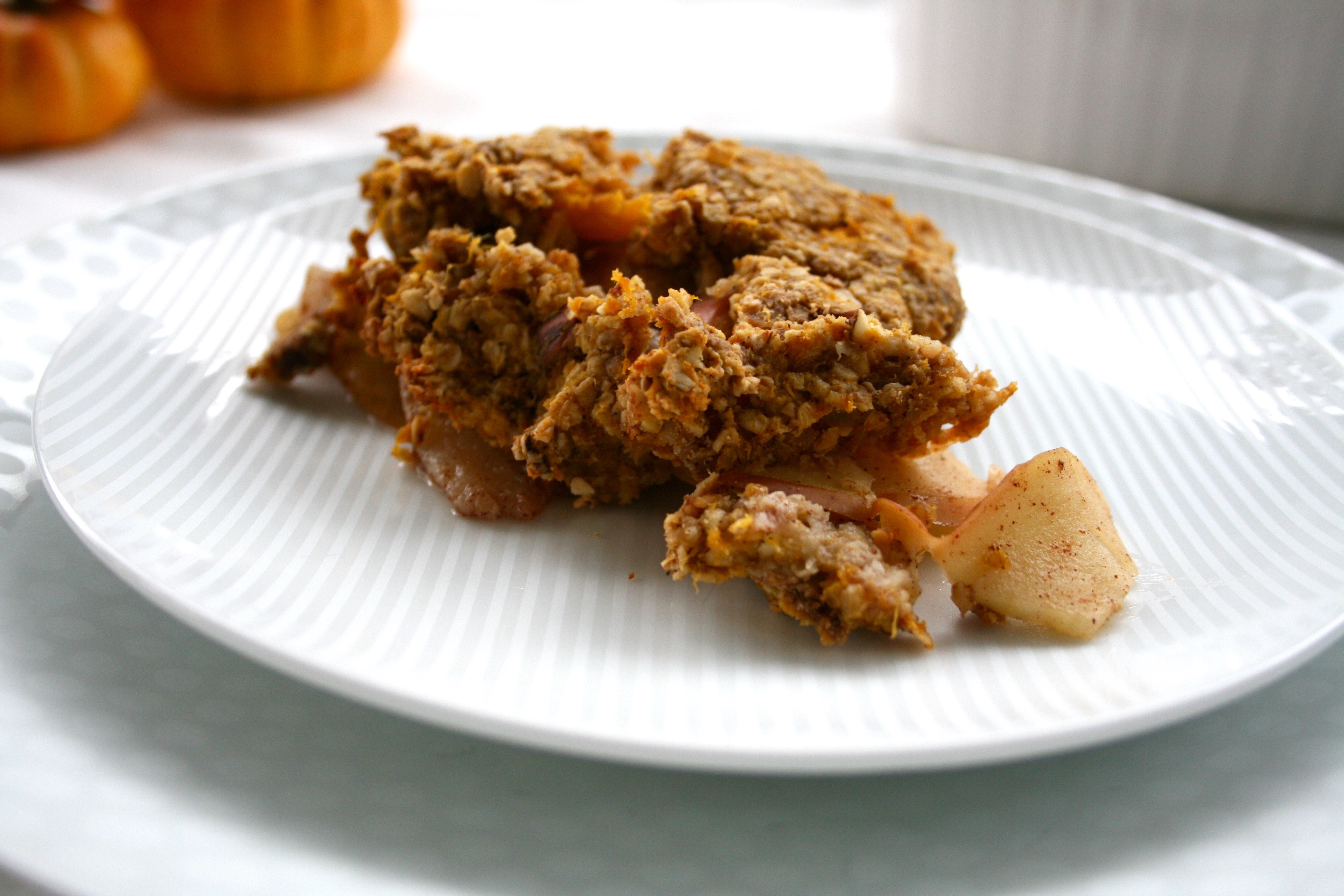 Apple Pear Crisp with Pumpkin Hazelnut Maple ToppingCrisps are one of my favourite sweet comfort foods that can be pretty healthy with a few tweaks. I like to add in nut butter and maybe some nuts to the oat based topping for some extra protein and healthy fats to moderate the sugar from the fruits and slow down digestion. This keeps blood sugar levels more stable and makes the dish more filling. Since it’s October I also added in some mashed pumpkin to the topping, giving it a seasonal twist and big boost of vitamin A. Maple syrup gives it some sweetness while cinnamon and ginger add some spice.Apples and pearsApples and pears, two tender and refreshing fall fruits, pair well together for a light base.PumpkinsPumpkin, hazelnuts and maple bulk up the dense, crunchy topping.Apple pear crisp baseSlicing the apples and pears thinly makes them cook faster and keeps the dish easy to eat, so that both fruit are in every bite. Sweeter varieties are best, like bartlett pears (wait until they ripen from green to yellow to get them at their sweetest) and gala or honey crisp apples. I left the skins on for extra fiber and vitamins, they soften up enough during the cooking process to not be noticeable at the end.Apple Pear Crisp with Pumpkin Hazelnut Maple Topping