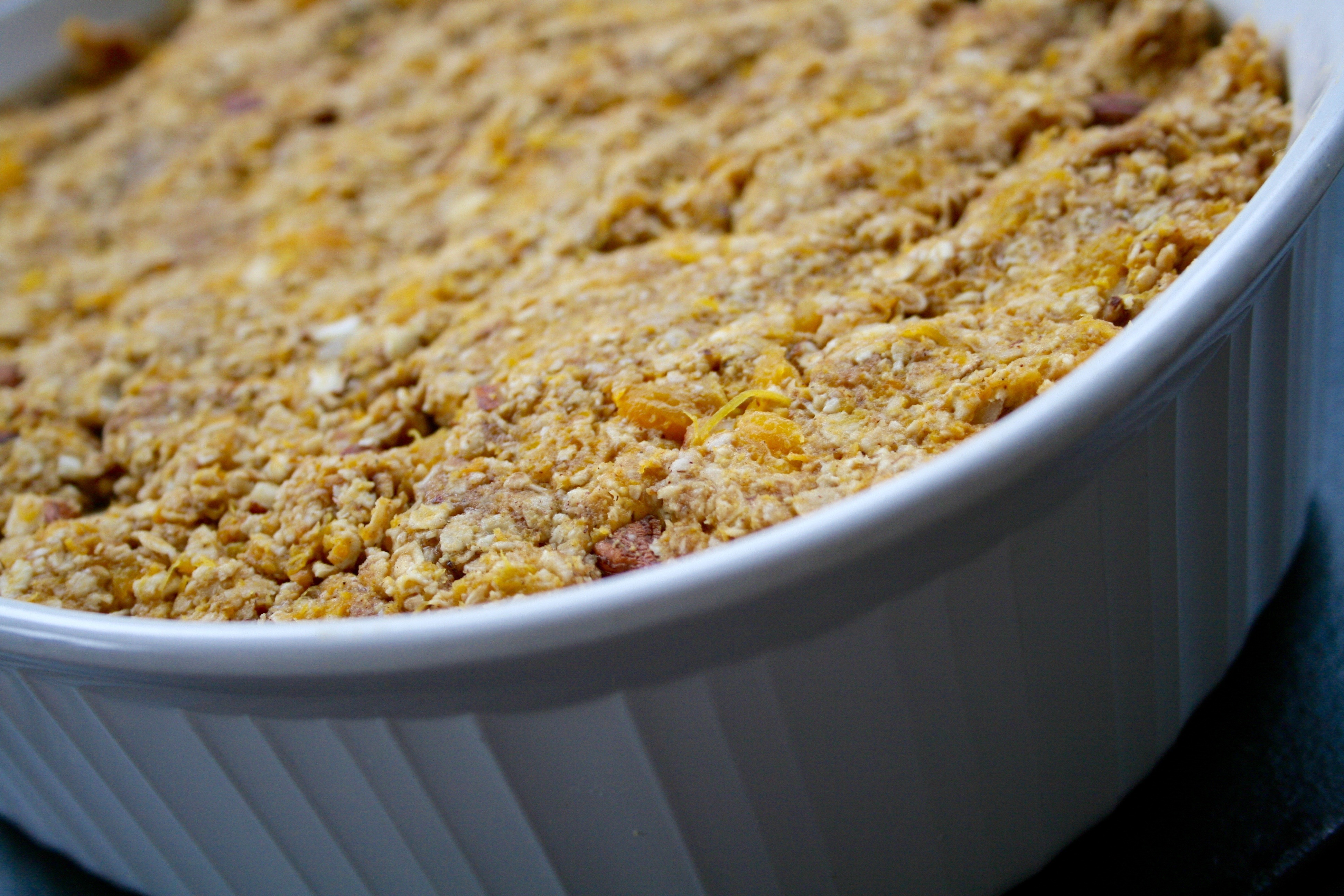 2. Mix together the bottom layer ingredients in a deep 9x12 inch dish (approximately- use whatever dish fits) then press down firmly so there are no spaces between the fruits. Place the oat mixture on top and press down once more so everything is compact. Bake for 30 minutes, until golden brown then set aside to cool for 5-10 minutes.