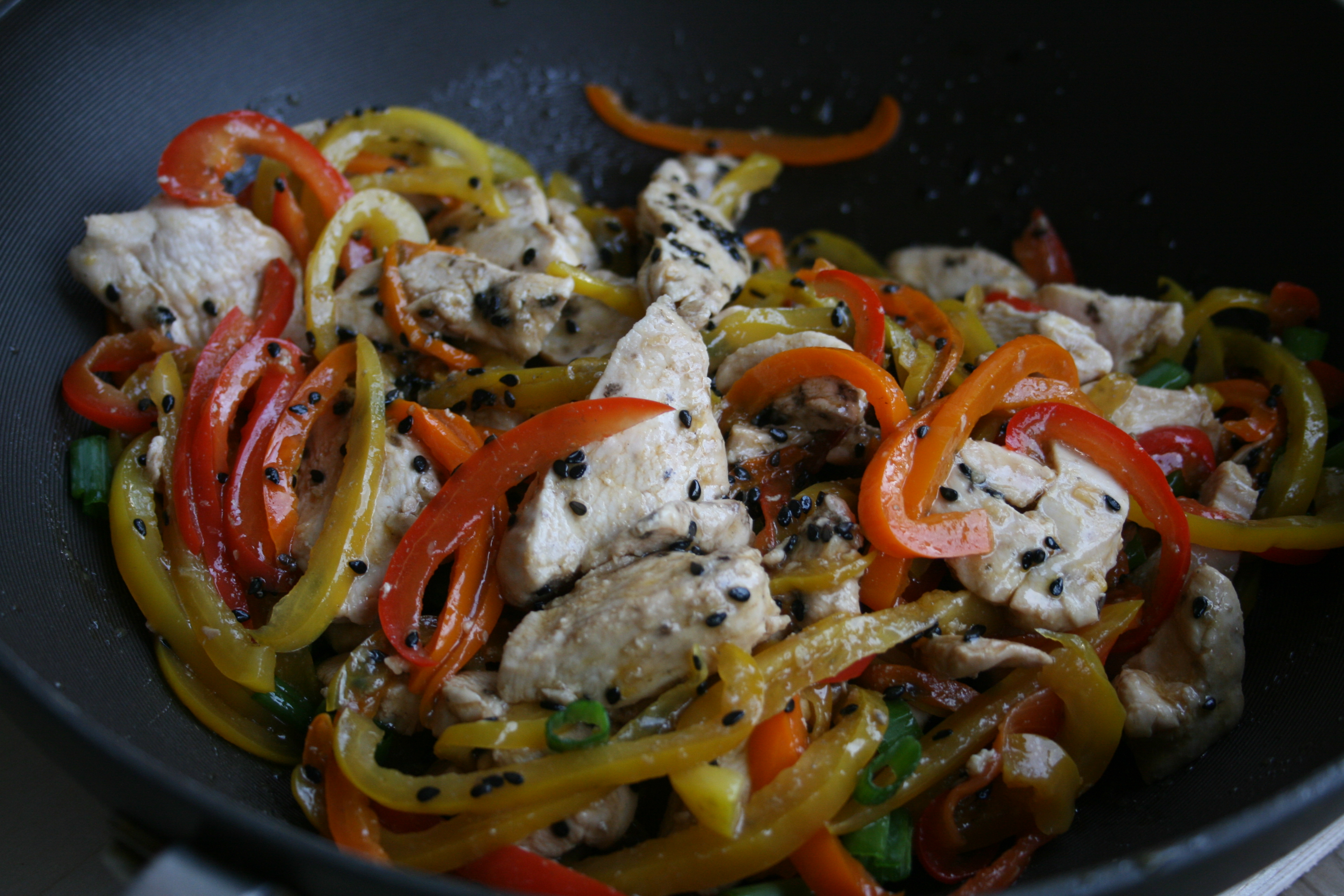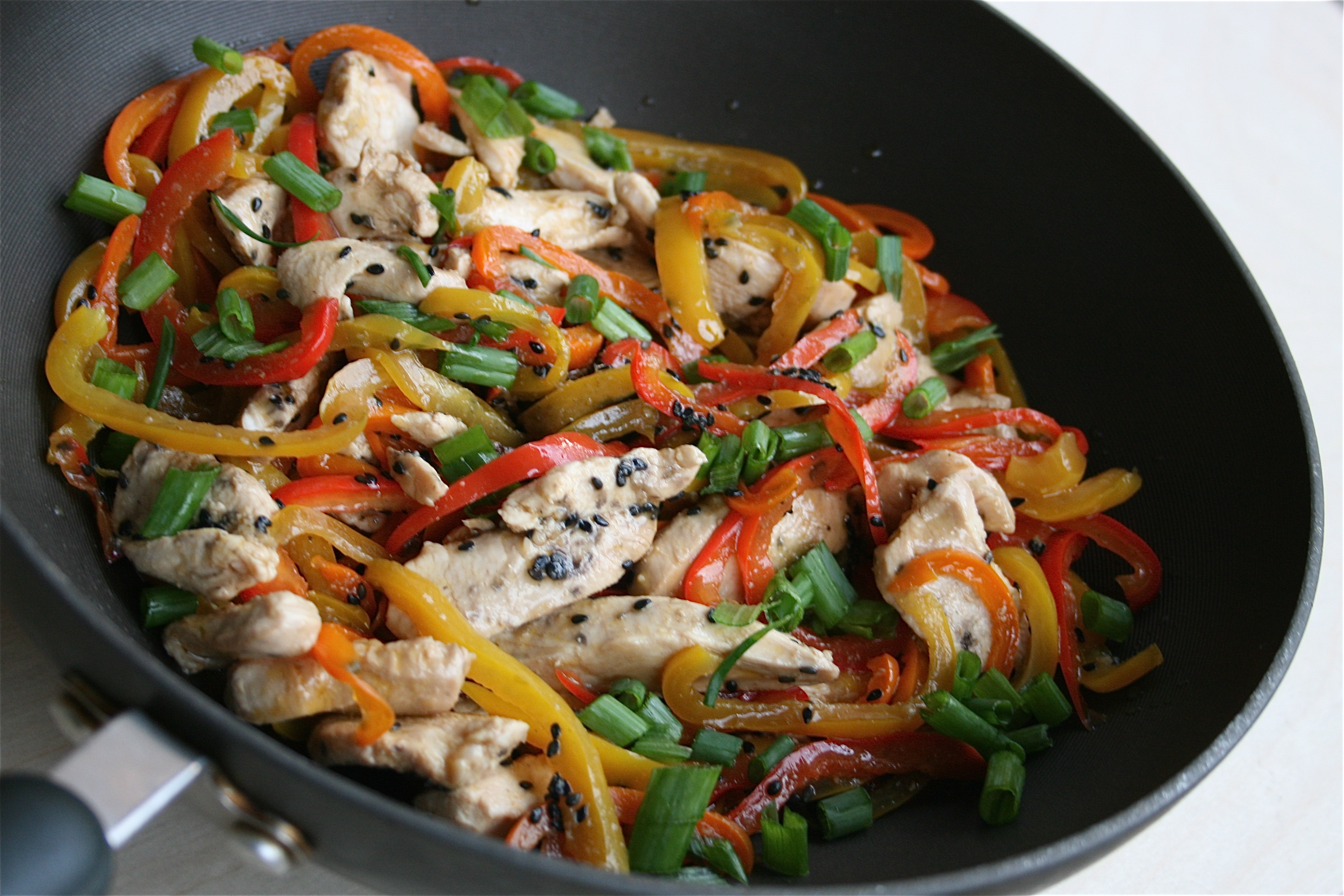 - Heat sesame oil in a wok over medium high heat on the stove. Once warmed add in the garlic and ginger and sautée for 3-4 minutes, until lightly browned and very fragrant. Add in the chicken and continue to sautée until it is cooked through and starting to brown, around 7-10 minutes. Fold in the peppers and stir occasionally for 2-3 minutes until they are softened. Remove from heat and stir in the tamari, vinegar, green onion and sesame seeds.