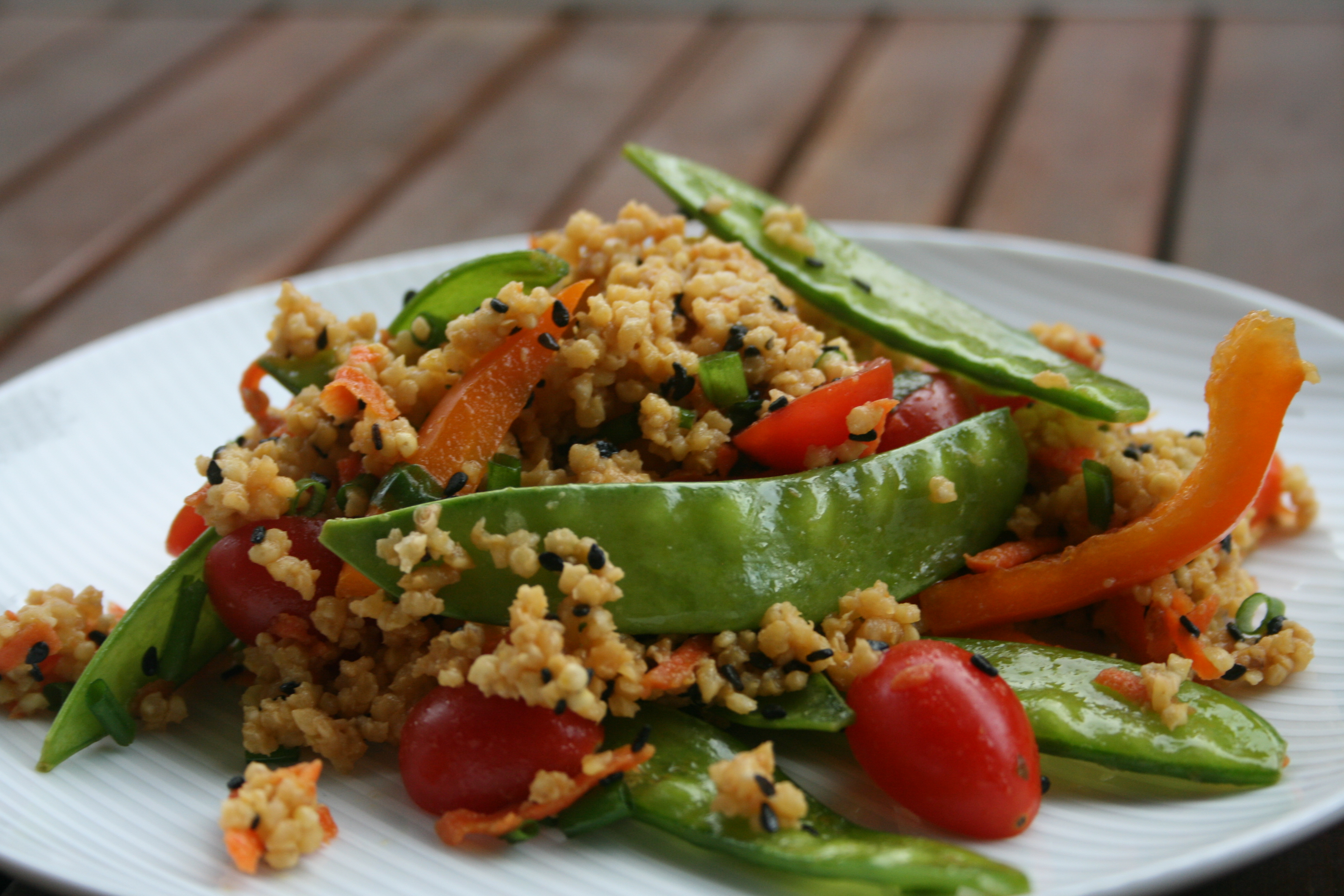 - If the millet has been refrigerated, heat it up in a large pan on the stove over medium high heat, stirring constantly. As reheating, add in ¼ to ½ cup of water, bit by bit to prevent the millet sticking on the bottom and to keep it moist. If the millet is freshly cooked and warm this step can be omitted. Add all the ingredients into the warm pan of millet and stir gently to combine until evenly mixed. The warmth of the millet will slightly soften the vegetables and make the sauce distribute better. Serve warm.