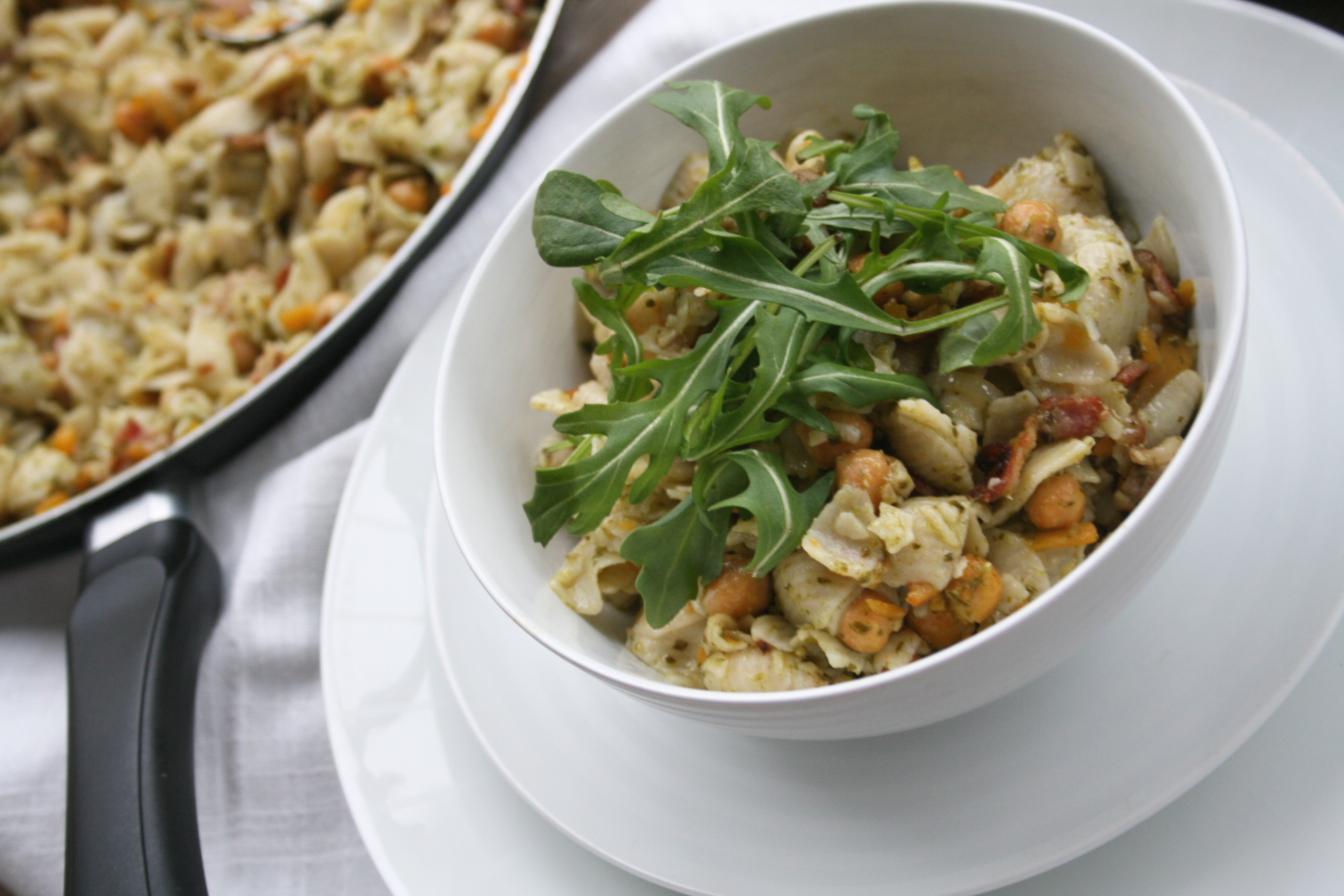 A comforting bowl of pasta can get some extra nutrients by using whole grain pasta, adding in some fiber and protein rich buttery chickpeas and sneaking in a vegetable that become quite tasty and pretty inconspicuous like sweet butternut squash. Bacon provides a ton of flavour and makes the dish extra filling while a light, oil-based sauce like pesto enhances all the other flavours and keeps it from getting too weighed down.