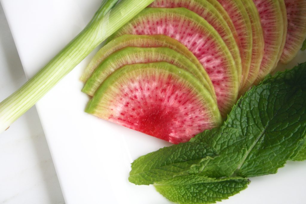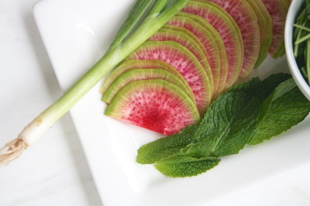 • 1 watermelon radish, peeled, sliced thinly then quartered