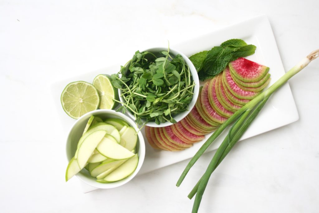 4. Have the lime juiced first in the base of a medium sized bowl, then cut the apple and stir the slices around in the bowl with your hand until each piece is coated with the lime juice. Remove the apple then do the same with the radish. There should be enough juice from just one lime to cover all the slices of each and it will keep them crisp and vibrant.
