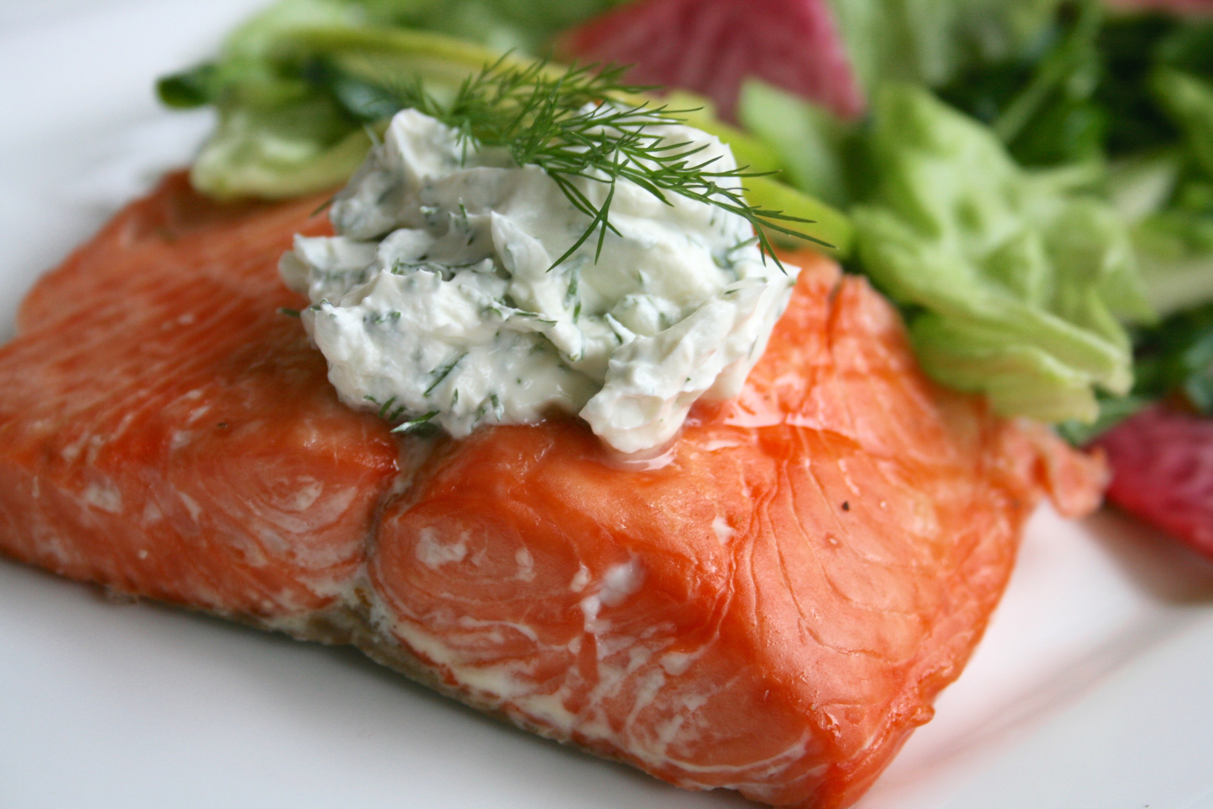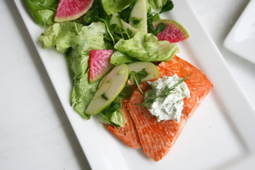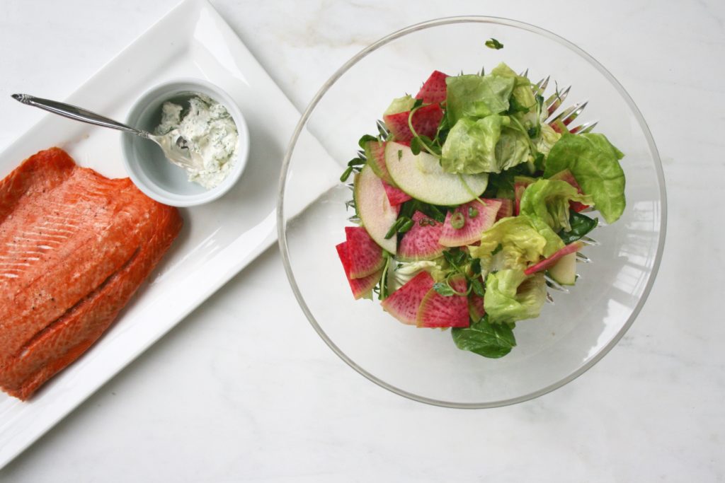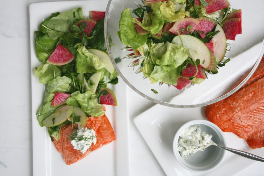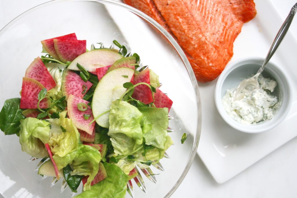 A good piece of wild salmon is one of the healthiest foods to build a meal around. Add in a fresh, colourful salad with a light vinaigrette and perhaps a little topping for the salmon and voilà- a well balanced plate loaded with beneficial nutrients. When it comes to eating healthily, a palm sized piece of simply baked fish and a mound of vegetables is pretty near perfect.This salad features some tart flavour from the granny smith apple, lime and radish. When combined with soft butter lettuce, spinach and pea shoots and tossed in a honey lime vinaigrette it can be very refreshing. Watermelon radish is named for its appearance and not its flavour. While it looks very similar to watermelon it has a typical radish flavour- fresh and slightly sharp. Technically it is a variation of daikon radish and it is much more mild than usual radishes. Tossing it in an acid like lime juice helps it to keep its vividness and tones down its flavour, making it blend well into a salad without overpowering the other ingredients.Salmon is a great source of omega-3 fatty acids, a type of fat that we can benefit from consuming more. On the inside it ensures that our nervous system will work at its peak of efficiency and on the outside it can keep our skin glowing and our hair and nails strong and thick. Go for wild when possible for the biggest doses of omega-3s.Crème fraîche is made from heavy cream and buttermilk, it is kind of similar to sour cream though it is less sour and even more creamy. It has a higher fat content so it stays intact even when heated or placed on hot foods and just one spoonful can be enough to get a little along with each bite of salmon. When combined with dill and a bit of lime juice it is kind of like a simple tartar sauce and can easily compliment a fish as flavourful as salmon.