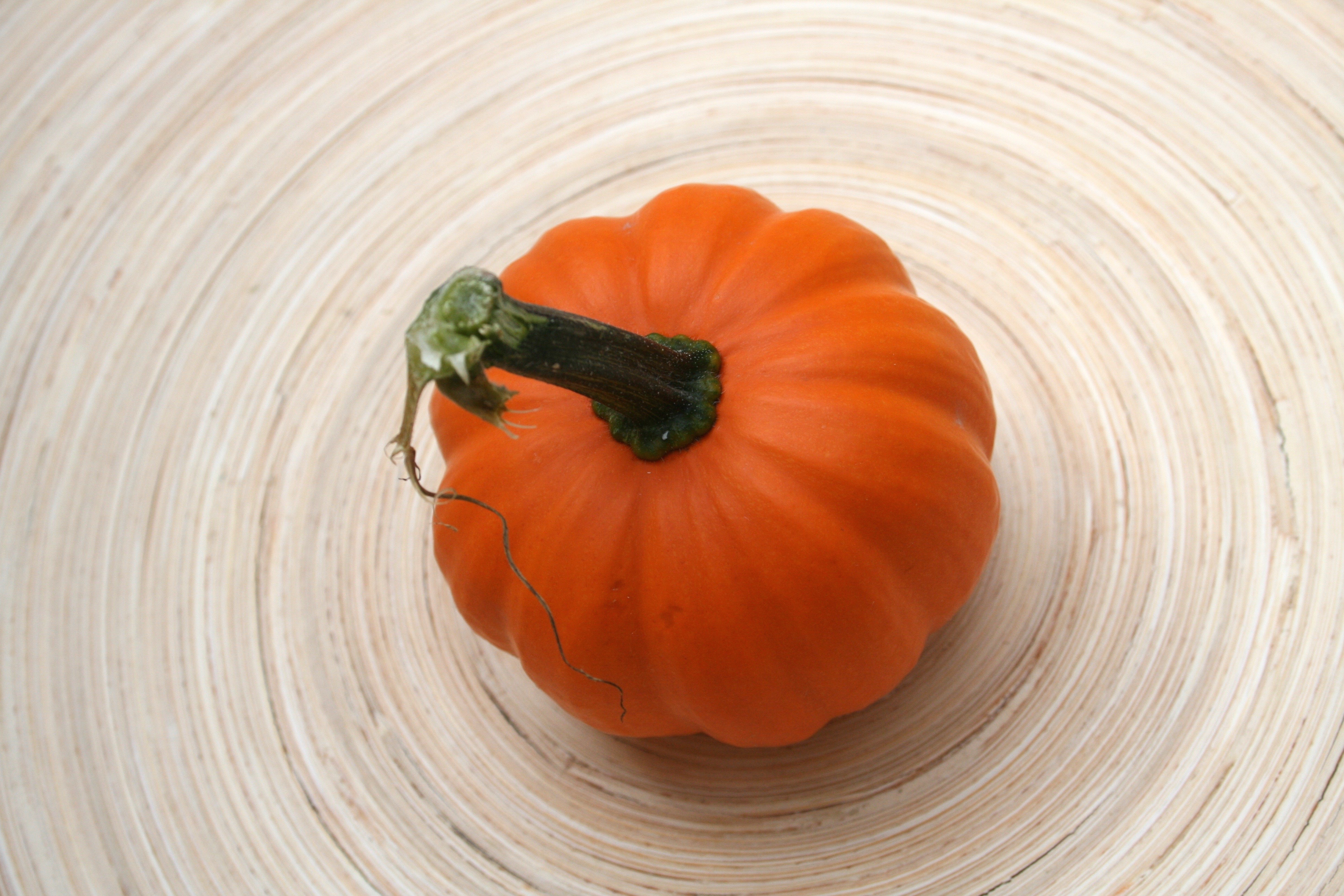 There are usually a couple types of mini pumpkins at markets this time of year. These ones, with shallow ribbing are usually called pie pumpkins and are about the size of a man’s closed fist. Another type, usually called decorative pumpkins have much deeper ribbing and are shorter and wider, they are not as ideal because their flesh is more bland but they work if need be.