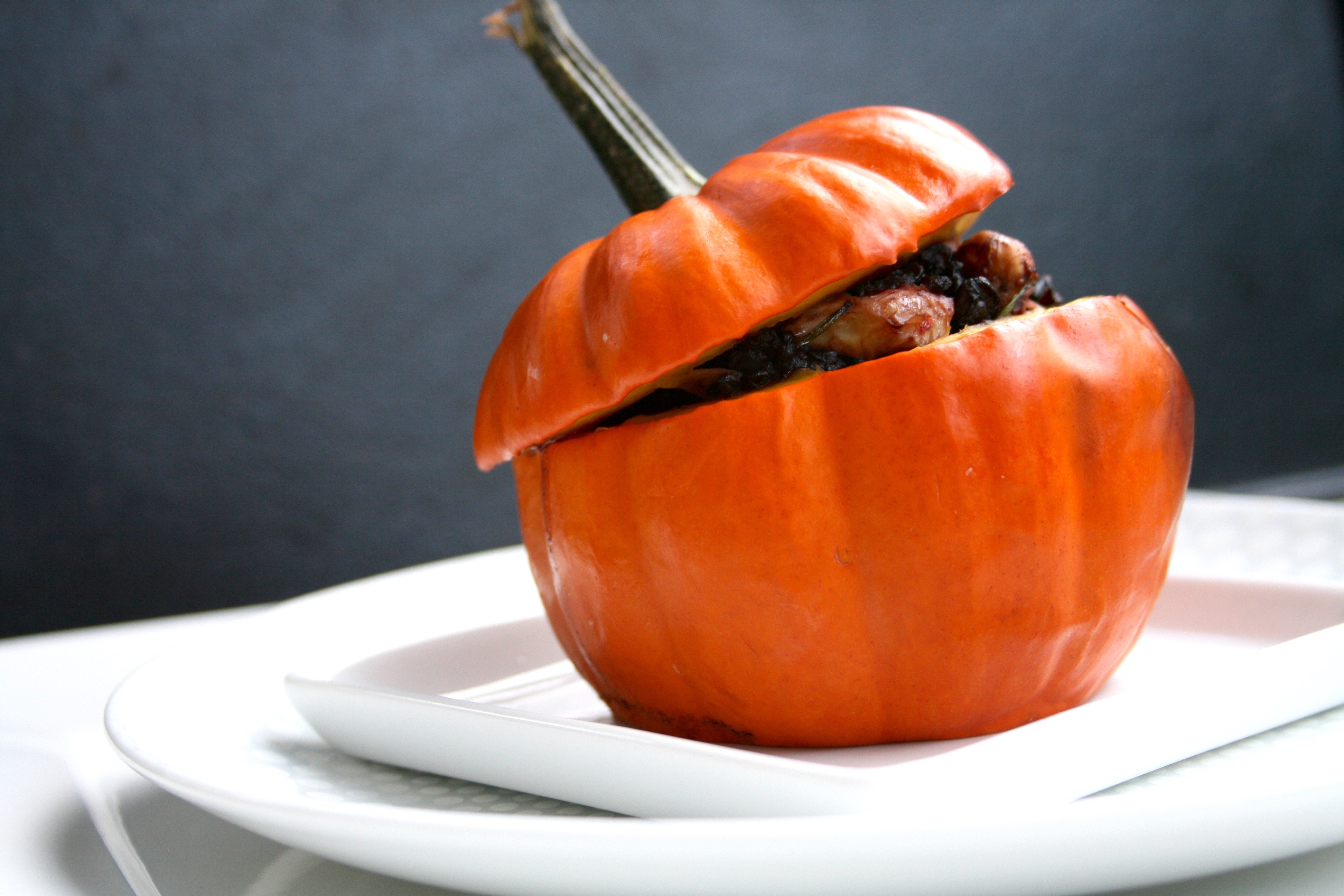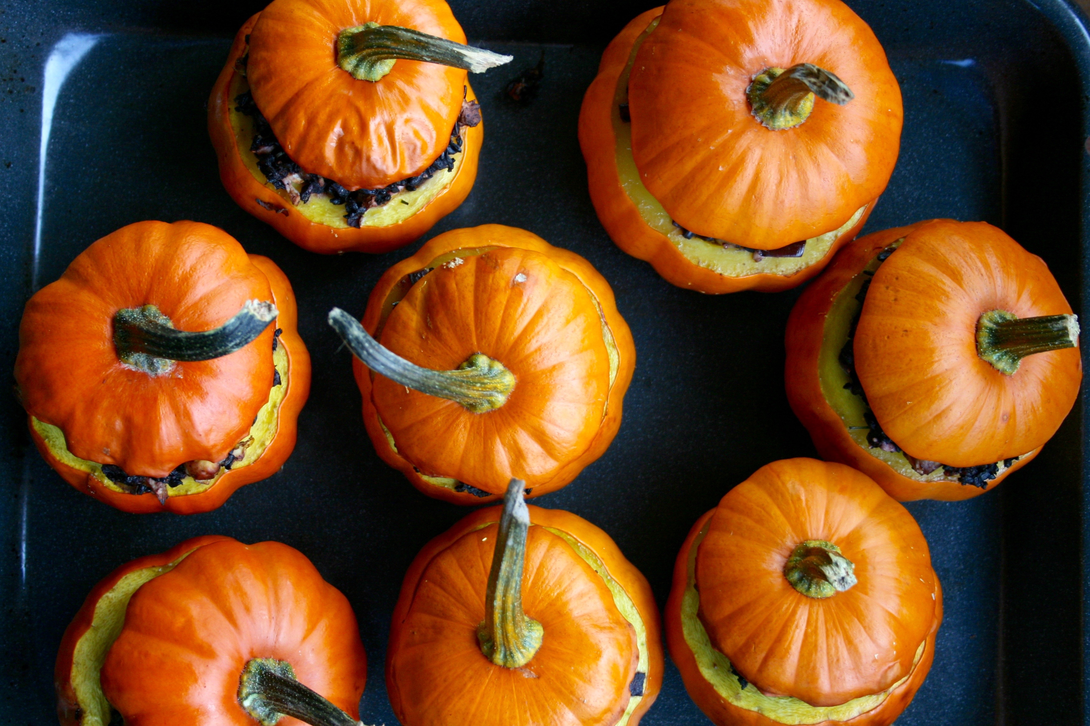 Stuffed pumpkins are a very seasonally appropriate and healthy side dish. The best part is that the filling can be made the night before or morning of serving and the pumpkins can be hollowed out, placed in a pan, covered tightly with plastic wrap and refrigerated. Then the mixture just needs to be spooned into the pumpkins and it all bakes for 40 minutes. This makes it ideal for serving guests because it does not require much attention at this point, so you don’t get tied down to the kitchen and have more time to visit. The pumpkins themselves have a sweet, dense flesh that goes nicely with heavy whole grains and legumes. The outer skin is inedible and acts like a bowl, keeping everything together. This is a very grounding dish, with enough fiber, healthy fats and protein to slow down digestion and leave one with a comfortably satiated feeling. As the weather gets colder we can maintain balance by choosing heavier foods and something like this offers a lot of nutrients.