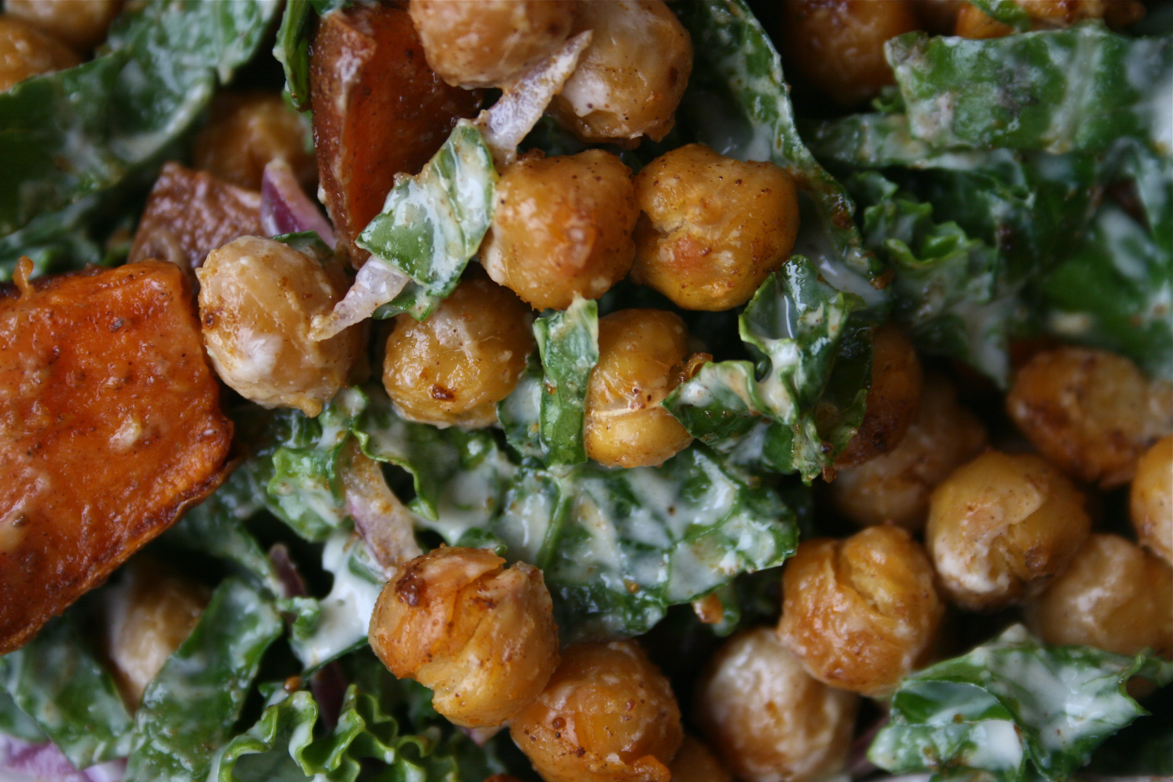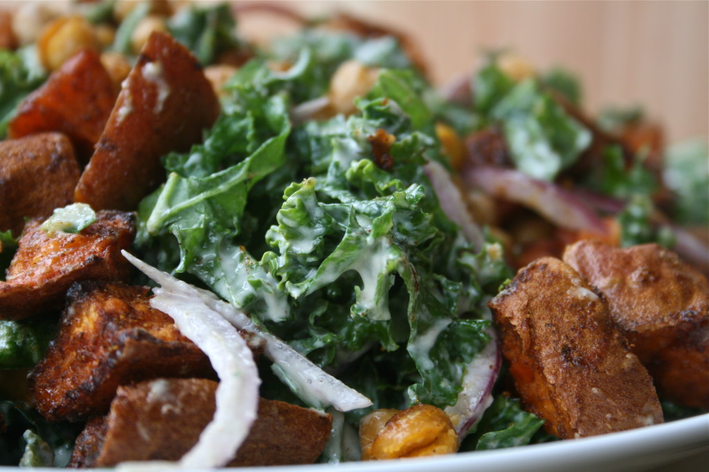 This salad also has many sulfuric compounds in the garlic, onion, chickpeas and kale which are essential for the production of collagen and keratin (both lead to healthy and lustrous skin and hair) and for supporting the liver, our body’s main organ of detoxification. The yams, kale and chickpeas are all high in fiber which helps keeps things moving in the digestive system- essential for regularity, efficient detoxification, and creating a strong and well nourished body… However, this many not be the best meal to eat before a date.
