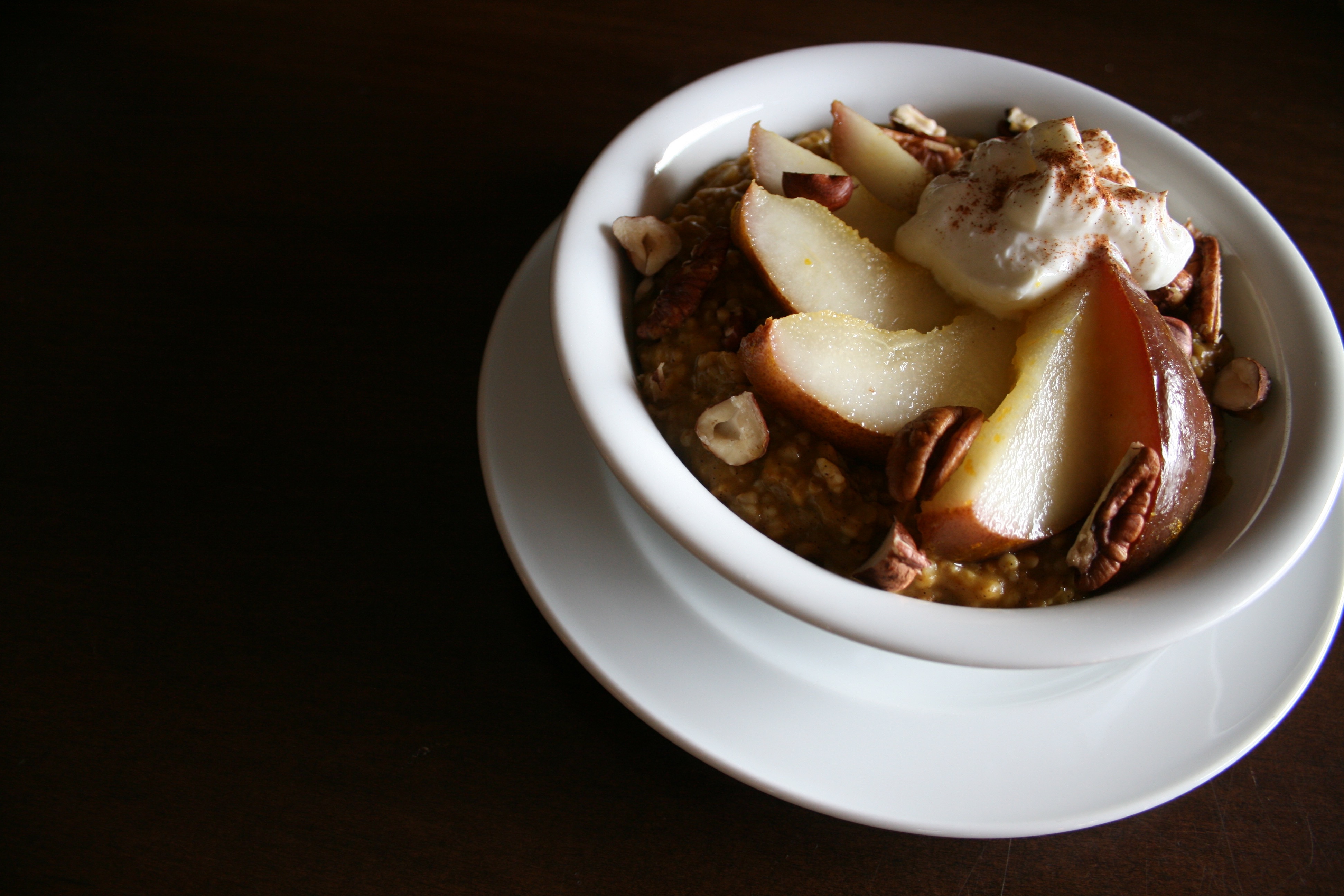 Vanilla Pumpkin Steel Cut Oats with Ginger Orange Poached Pears