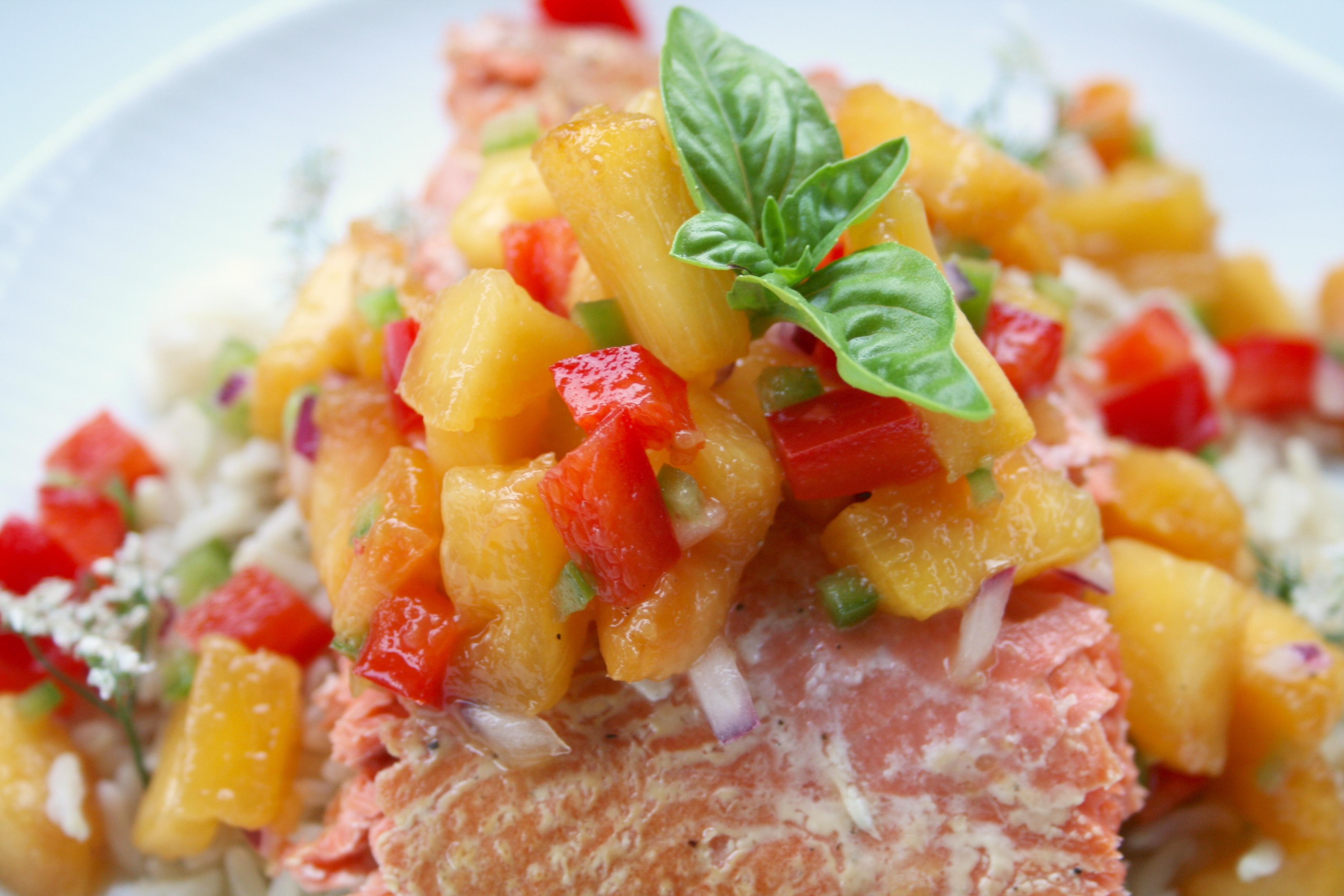 Cedar Planked Lime Salmon with Peach SalsaFresh wild salmon cooked on a cedar plank over the grill creates the centre for a really healthy, nutrient dense dinner for hot days. This method imparts some smokiness from the BBQ and woodsy flavours from the cedar. Adding a fruity salsa on top keeps it light and fresh and the sweetness of a fruit like peaches compliments the richness of the salmon.Peach SalsaCedar Planked Lime SalmonCedar Planked Lime SalmonWild salmon is one of the best animal sources of protein because it is relatively lean but high in omega-3 essential fatty acids. Unlike some other fish, it is quite low in mercury (a heavy metal that can get quite concentrated in seafood) so it has lots of the good stuff and limited amounts of the not so good stuff. According to some American health and environmental agencies, wild salmon from the Pacific has a rating of “very low” and wild salmon from the Atlantic has a rating of “low” when it comes to levels of mercury. As with all foods, even the healthy ones, moderation is best but salmon is a good food to have every week or two.