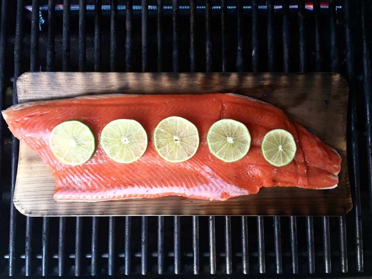 1. Soak the cedar plank, fully submerged in a sink of water, for 2 hours. Near the end of that time preheat the BBQ. Place the plank on the grill over direct medium high heat for 5 minutes. Meanwhile drizzle the olive oil and sprinkle the salt and pepper over the top of the salmon fillet then place lime slices on top.