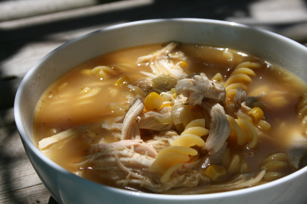 I made this soup because my brother is starting to get sick and since we are going to Whistler tomorrow I don’t want him to miss out on the activities I have planned for us. Chicken noodle soup is a very nourishing and healing food for our immune systems. Quite often a few bowls of soup like this with some extra vitamin C and a day of rest will be effective in warding off colds and the flu… although I have been pumping him with extra vitamins, minerals and chlorella (a protein powerhouse and a type of blue green algae) just to be safe. They key in this soup’s healing powers lie in the type of broth used. The boxed and canned versions just will not cut it. Since I didn’t have the time to prepare bone broth myself I took a shortcut and purchased some from the closest health food store, along with a whole organic chicken already cooked, a bag of organic frozen corn and a bag of organic frozen corn pasta. With corn I always recommend going for organic since the vast majority of what is on the market is GMO, and for chicken it is ideal, as is free range, since the breeds used are different and the birds are given better quality feed, space to roam and eat insects, and many more months to mature which leads to an end product with higher levels of vitamins and minerals. Plus they are free of antibiotics and hormones, making them much more healing to our bodies when our health is already compromised.