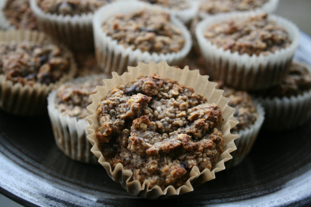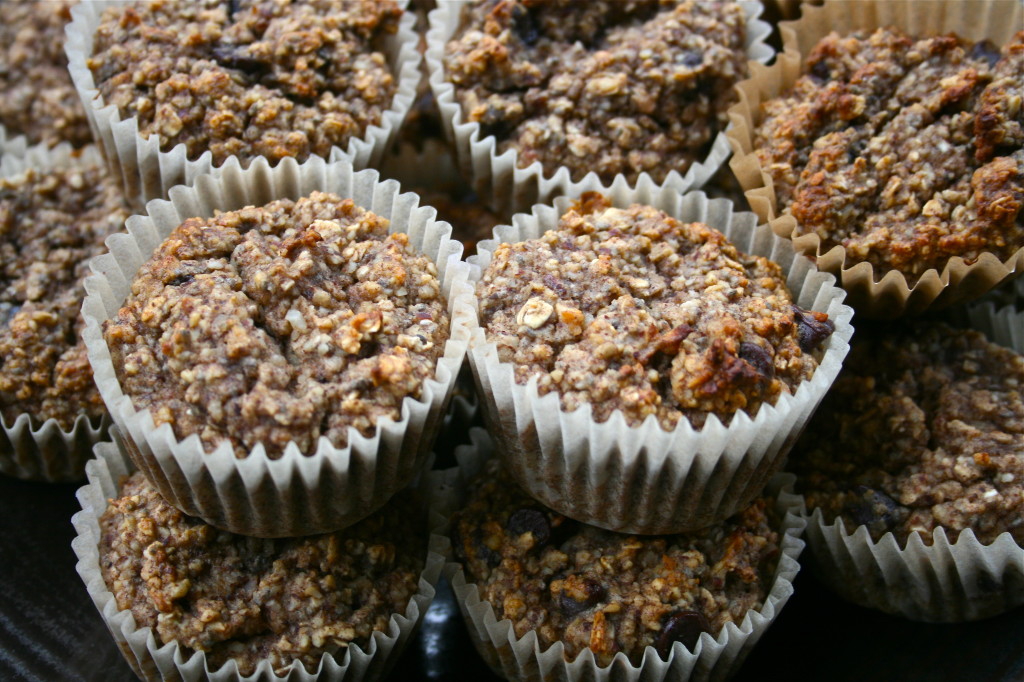 I’ve been experimenting a lot in the past few months with different gluten-free baking techniques. Coconut flour and gluten-free blends are some widely used options but I have found that the end product when using large quantities is usually really crumbly or slightly rubbery. Combining rolled oats and nut flour however, produces muffins and loaves that are dense, cohesive and moist. The oats are a great source of both fiber and protein (makes the muffins more filling), plus antioxidants, a few of the B vitamins (help increase energy levels) and several minerals including manganese, magnesium, phosphorus and iron. The almonds and hazelnuts are both high in many nutrients, especially unsaturated fats, vitamin E, fiber and protein. I used dates and frozen bananas as the only sweeteners, two options that are good alternatives for diabetics and people looking to cut down on processed sugars. They contain natural, easily digestible sugars and because they come in a package with lots of fiber, antioxidants, vitamins and minerals their impact is less severe on blood sugar levels and does not create the energy spikes and crashes that more refined sugary products do. The dark chocolate chips have more cacao than milk chocolate versions so a little goes a long way, or blueberries could be substituted for the caffeine sensitive.