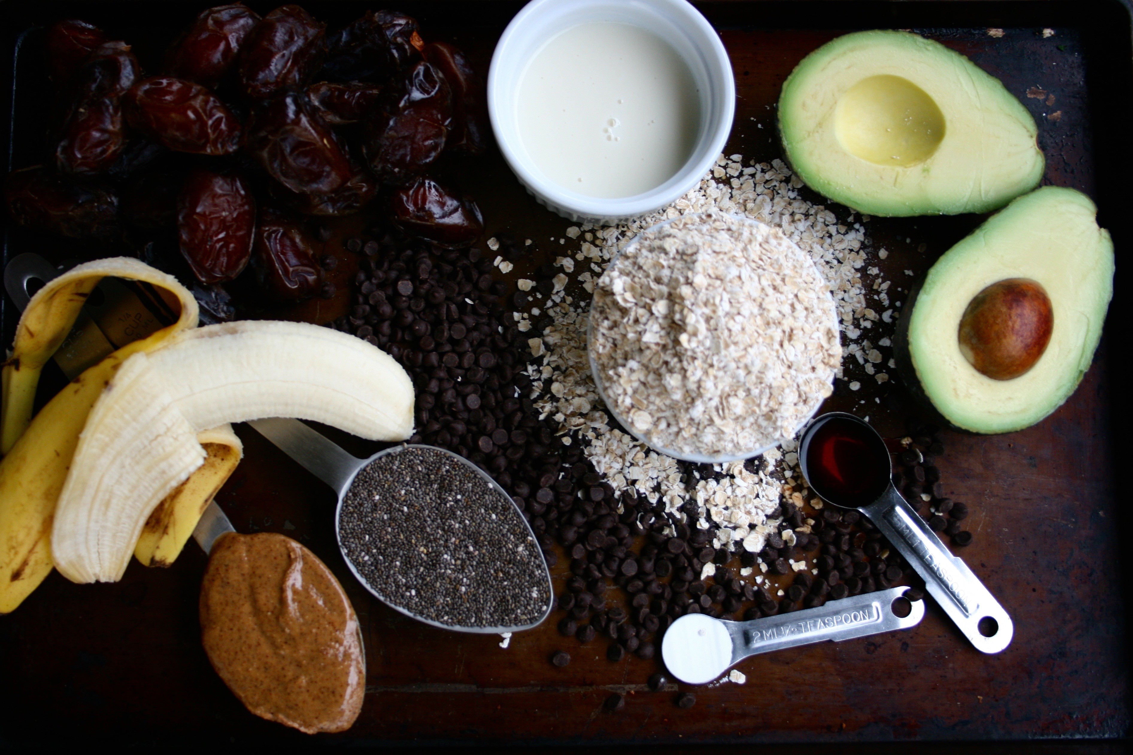 - Preheat oven to 325°. Blend together the wet ingredients (dates, almond milk, banana, avocado, almond butter and vanilla) until liquified in a blender or food processor. Fold in the dry ingredients (oats, chocolate chips, chia seeds and baking powder) and let sit for 5 minutes- the chia seeds will plump up, absorbing some of the liquid. Spoon out 2 tablespoons of the batter at a time onto parchment paper lined baking sheets. Bake for 17-20 minutes, until golden brown.