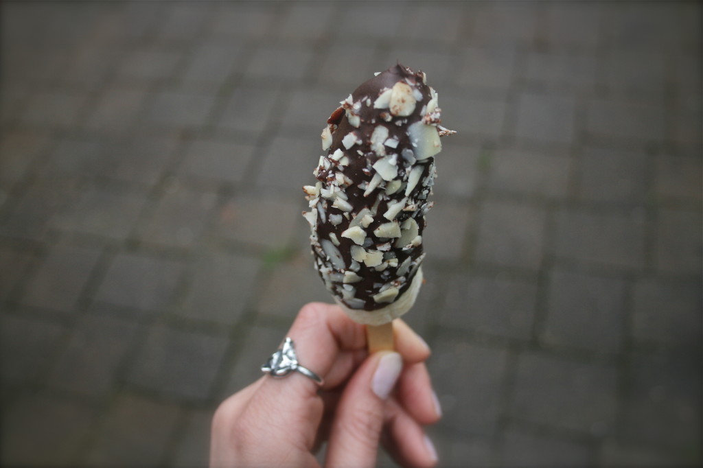 - Cut the bananas in half and insert a popsicle stick in the cut side through to the top, the further in it goes the more sturdy it will be. Spread out the almonds on a small plate and set aside. Heat up the chocolate and peanut butter in a small sauce pan over low heat on the stove until fully melted and mixed together. Hold the end of the popsicle stick over the container of chocolate and spoon the chocolate onto all sides and let it run down so the whole banana is covered, then roll the chocolate covered banana in the almonds until coated on all side. Once they are all done place them on a large wax paper lined plate and freeze for around 3 hours until frozen all the way through. Serve directly from the freezer or let them thaw for 5 minutes or so. They will keep for a week or so in the freezer in an airtight container.