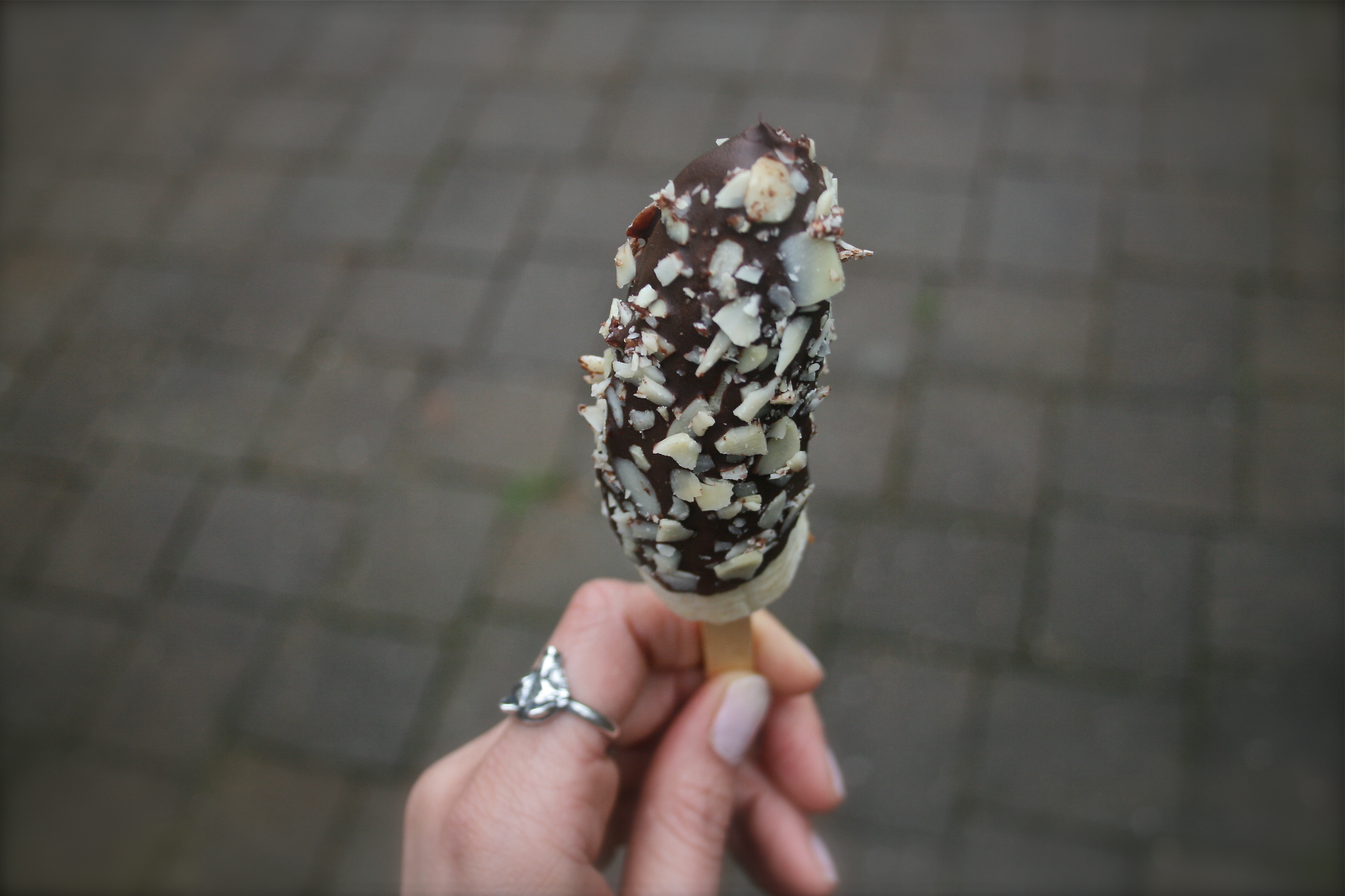 Frozen bananas have become a pretty well known (in healthy food circles) ice cream substitute, known as “nice cream” but they are also a great base for popsicles. From there the coating can be any kind of chocolate and the final topping can be any kind of nuts or seeds (although my brother is watching me type this and he says that seeds are only appealing to squirrels [he’s wrong]). Dark chocolate is ideal nutritionally because it has a higher concentration of cacao and usually less sugar. Cacao has several antioxidants and other nutrients, as well as compounds that lead to increased production of feel good hormones, making it a natural mood booster when used occasionally and in moderation.