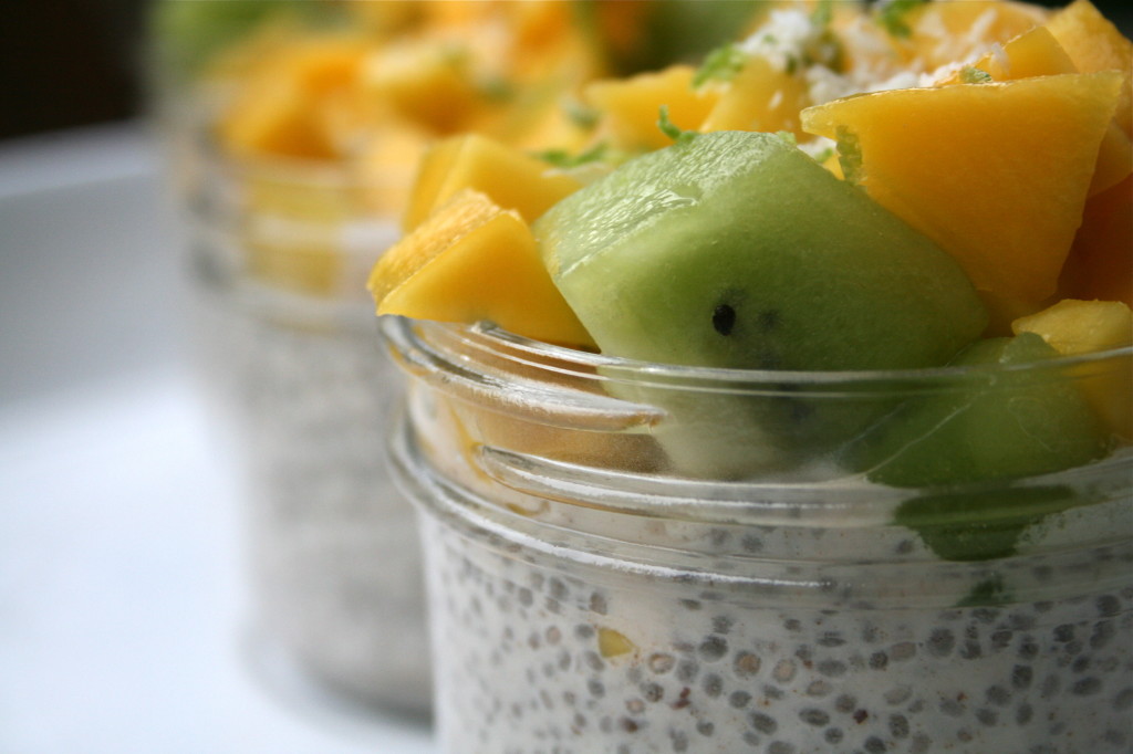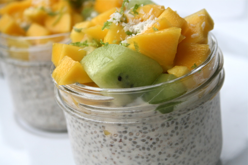 - Blend together the coconut milk and dates in a blender or food processor until the dates are broken up completely, then add in the chia seeds, vanilla and ½ of the lime juice and whisk until evenly combined. Pour into three separate jars or bowls and refrigerate for 20 minutes. Meanwhile place the kiwi and mango in a bowl with the rest of the lime juice to marinate. Once the chia pudding is thickened up serve with the fruit on top and sprinkle with lime zest and/or desiccated coconut. It will keep in the fridge for 2-3 days covered with a tight fitting lid.