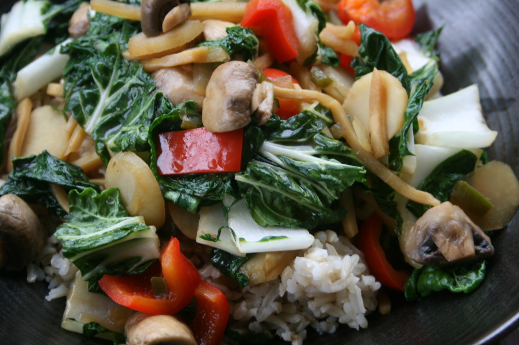 Coconut oil has a mild coconut flavor and it is one of the few plant oils to contain enough saturated fat to stay stable at high heats, making it ideal for stir frys. Tamari is a Japanese soy sauce with a richer but less salty flavor than regular soy sauce and it is generally made without wheat. Freshly squeezed lime juice is a great source of vitamin C and it really brightens up the flavors of a dish when squeezed on at the end. To get the most juice out leave the limes at room temperature then roll them firmly between your palm and the counter a few times before slicing and squeezing. Add these three ingredients together and you get a light sauce with some sweetness, some saltiness, a slight acidity and a fresh tropical flavor. My friend gave me the idea for this combination and it turned out even better than I thought. It will compliment nearly any vegetables but I kept it Asian inspired here with baby bok choy (leafy greens incredibly rich in vitamins K, C and A), water chestnuts (slightly crunchy aquatic vegetables used extensively in Chinese cuisine) and bamboo shoots (peeled bamboo harvested before it is two weeks old), plus some mushrooms, red pepper, onion and jalapeño for variety and a range of extra nutrients. Serve over cooked whole grains, cauliflower rice or whole grain noodles for a very light and clean but filling meal.