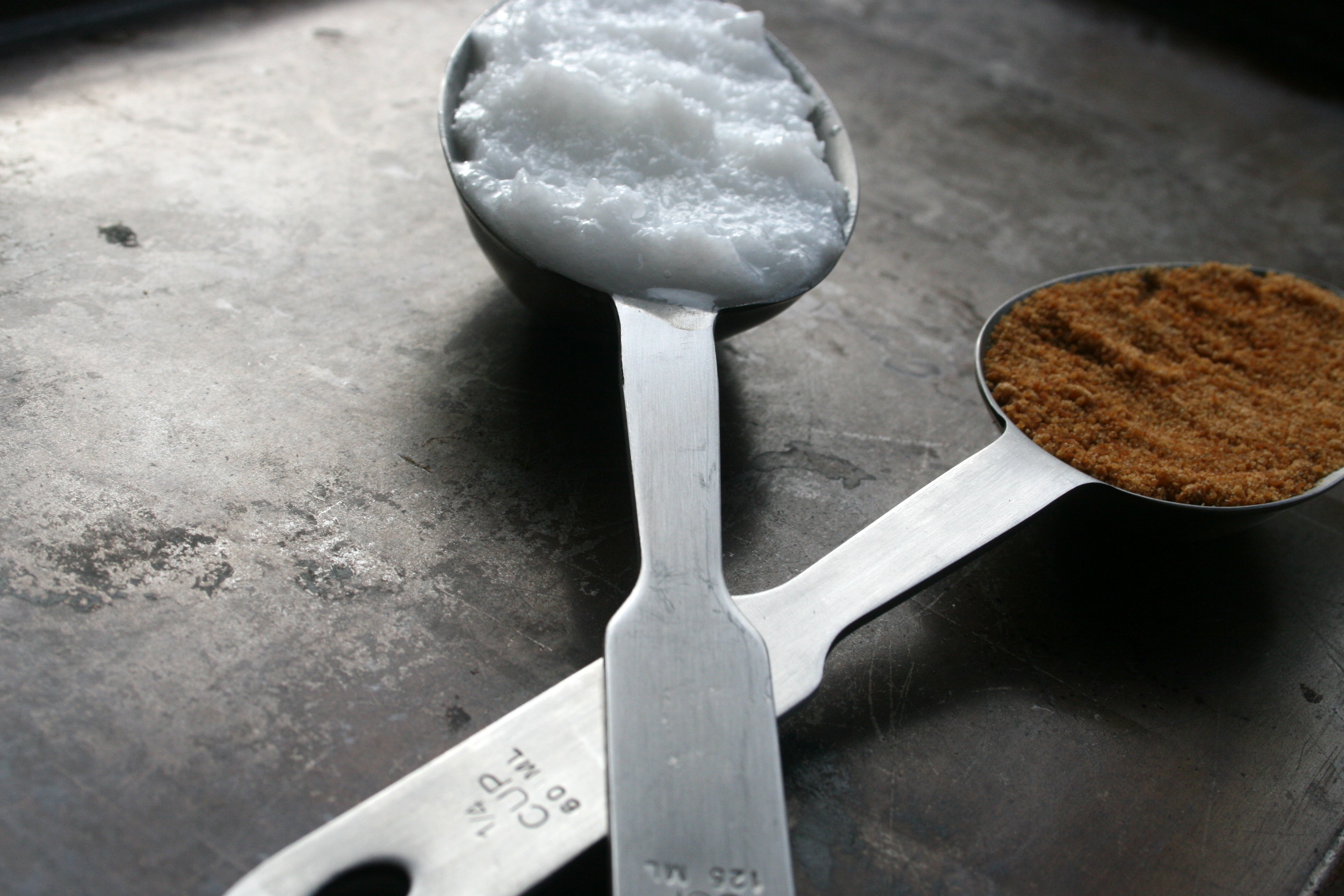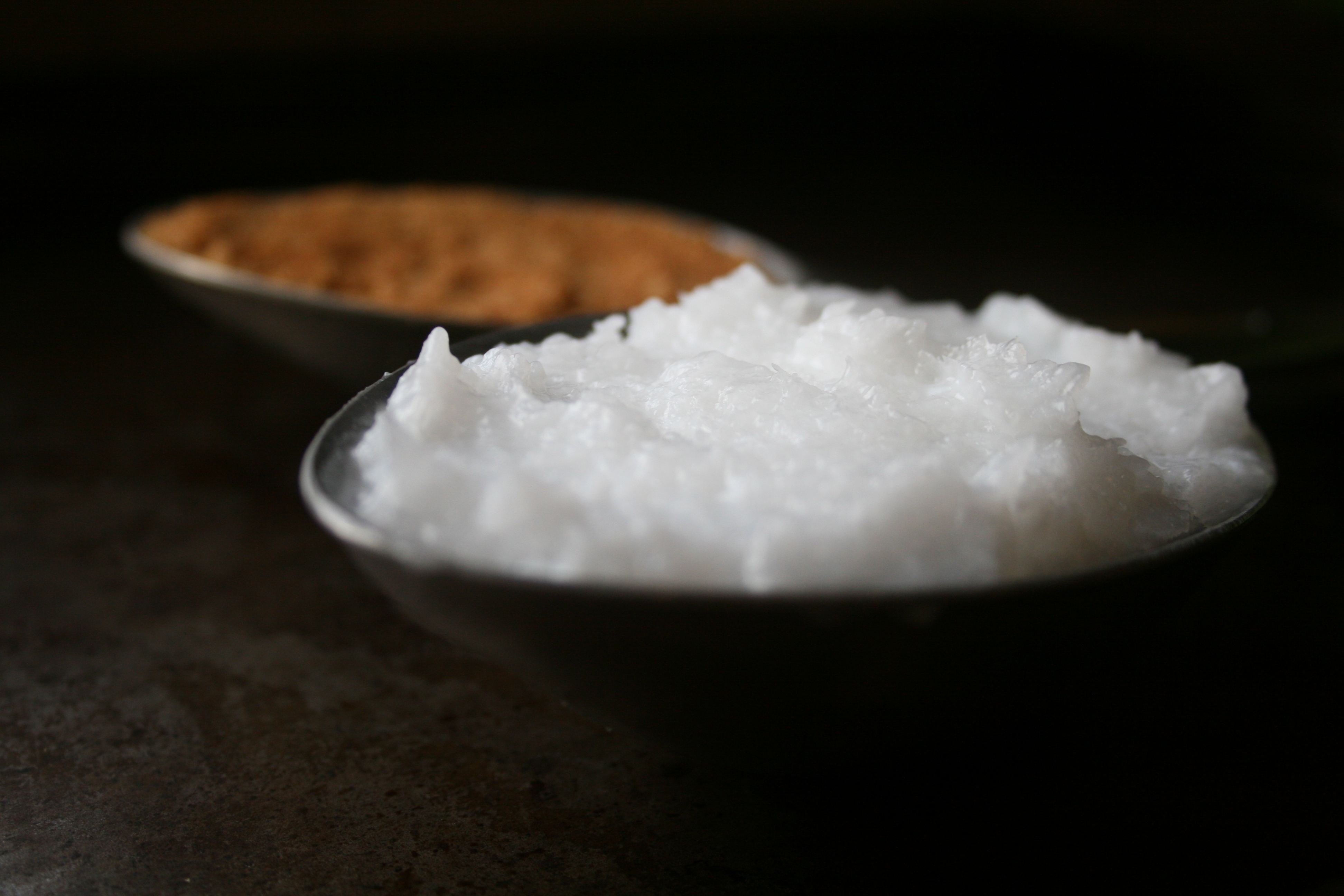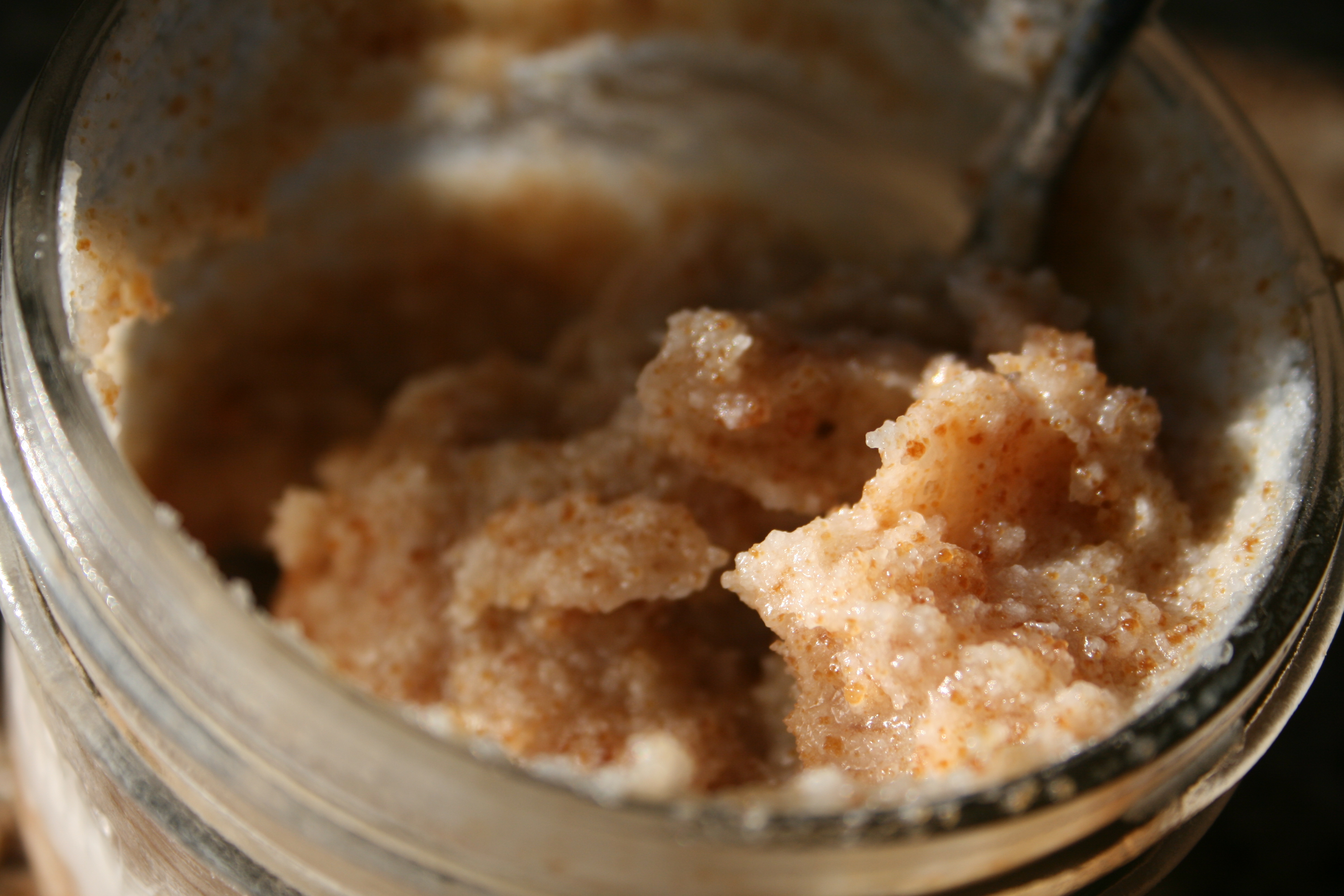 - Let the coconut oil soften up a bit at room temperature then stir in the sugar (and essential oils if using) and store in a glass jar.