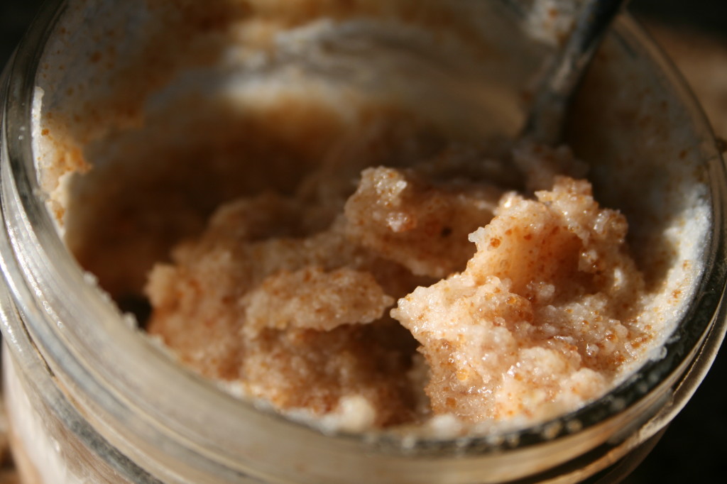 This scrub is not a marinade or rub for food- it is meant to exfoliate, moisturize and nourish our biggest organ, our skin. It is gentle enough to use on the face but strong enough for the whole body. If our skin produces oil (sebum) to moisturize itself, why not try using oil instead of creams and lotions full of chemicals and artificial fragrances? Each person’s skin is different and changes according to the season, nutritional status, environment and the stress one feels. There are many different opinions on whether diet affects skin, and if you don’t believe that it does try changing your diet and see what happens. I have found that what I put in my body affects it as clearly as what I put on it. There are several good quality ingredients we use in the kitchen that can be a real treat for our bodies. This scrub is simple with only two ingredients and works for all skin types. I put it in a jar and leave it in the bathroom where I rub it on at the end of a shower in a circular motion all over my skin then rinse it off with warm water and pat dry (be careful- the bottom of the shower may get slippery until the oil is all washed down the drain).