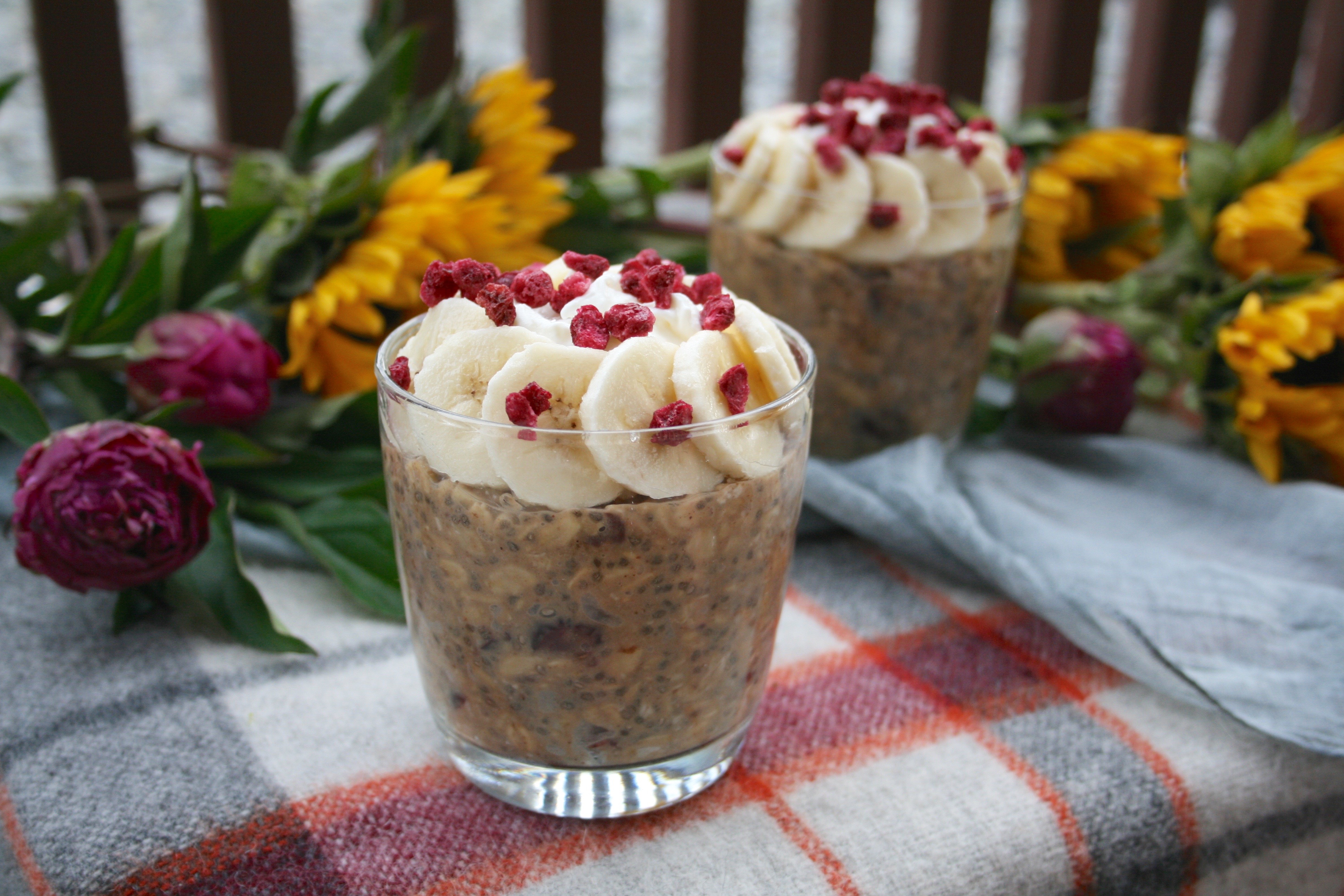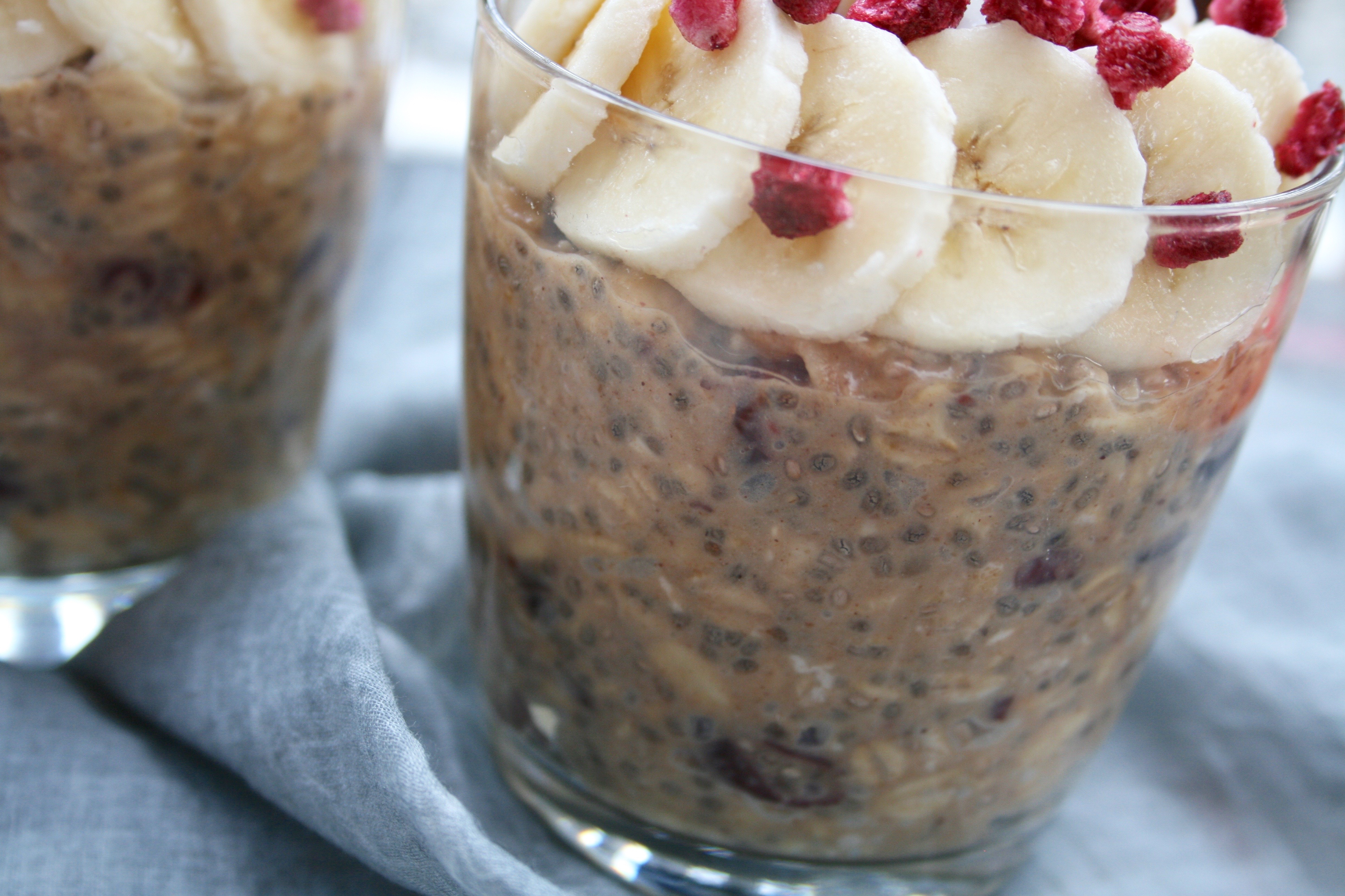The main ingredients are oats of course, and nut milk which softens the oats overnight as they sit. To get the chai flavour I simply brought the milk and tea to a simmer then let it steep for a few minutes before straining it and adding the chai milk to the other ingredients. Some dried cranberries add texture variety and a slightly sour flavour while the dates add in lots of natural sweetness to keep it balanced. Some chia seeds plump up and thicken the mixture, and along with some hazelnut butter they make oats extra creamy.