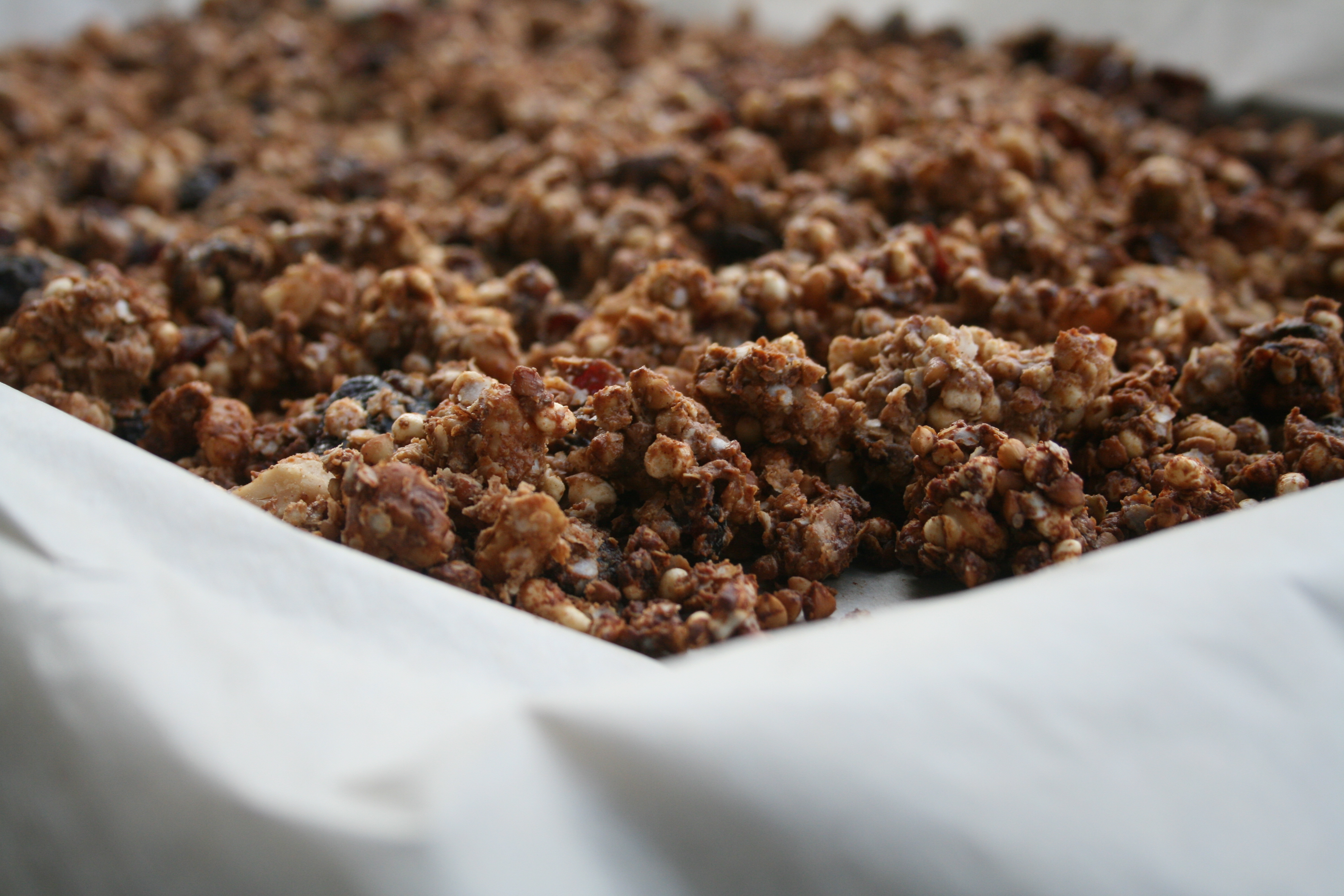 - Preheat oven to 300°. Mix together the walnuts, quinoa flakes, buckwheat, millet puffs, cranberries, cinnamon and nutmeg in a large bowl then stir in the honey and almond butter. Spread out the mixture on a parchment lined baking sheet and bake for 30 minutes, stirring halfway through.