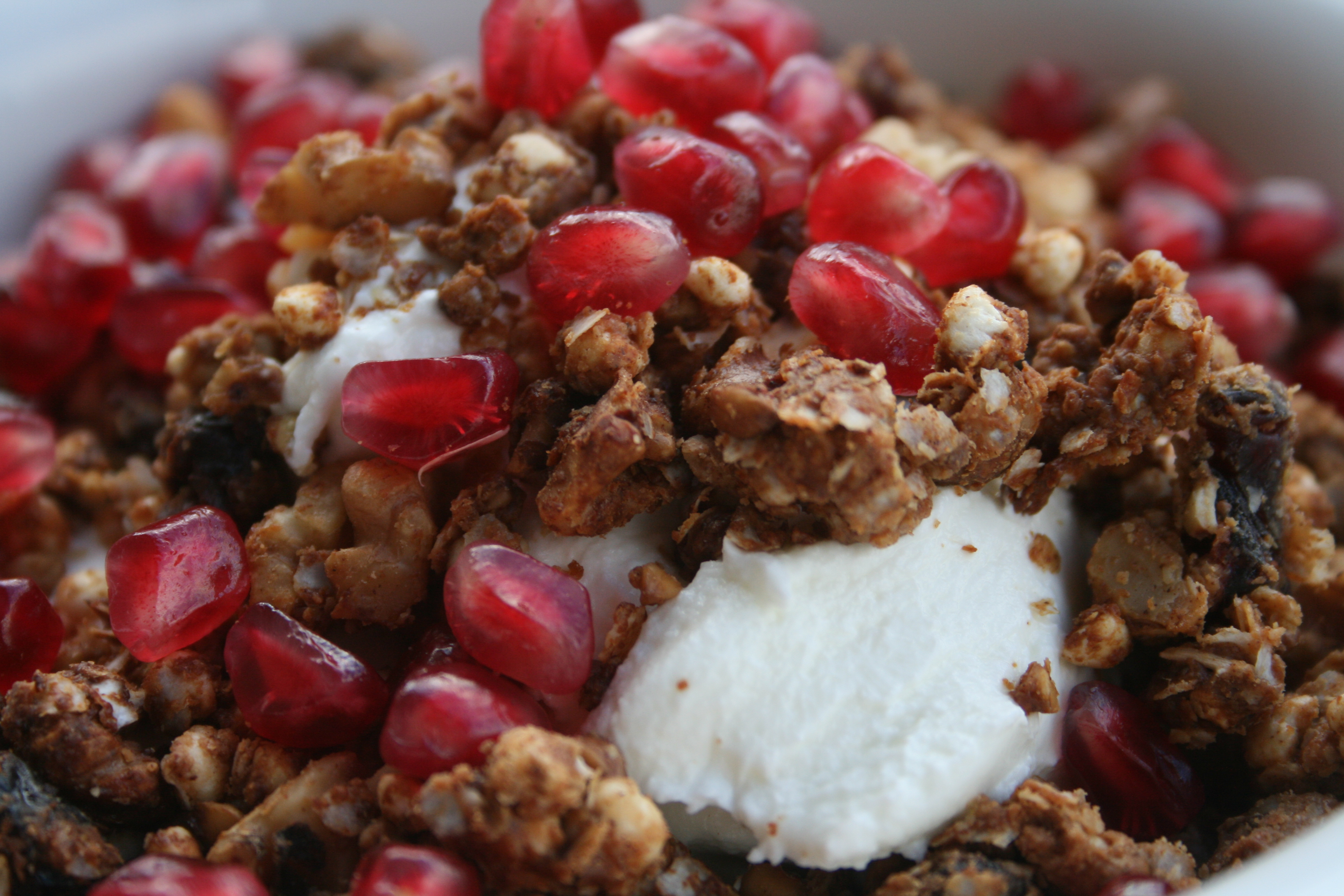 Granola is one of the easiest things to make and just a little bit goes a long way to dress up a bowl of oatmeal or plain yogurt. Artisan granola is quite expensive but if you buy the ingredients in bulk it can be a very cost effective homemade endeavor. The stars of this particular granola are walnuts and cranberries. Out of all nuts, walnuts have the highest amount of omega-3 fats, an essential fat that most of us on Western diets need more of; just avoid any nuts that look shriveled or discolored, as they are no longer fresh and their oils have probably gone rancid and lost their health benefits. They are also a good source of antioxidants, vitamin E, several B vitamins and many minerals. Cranberries are also high in antioxidants, as well as vitamin C and numerous other vitamins and minerals. I also added in a few different types of whole grains with vastly different textures, the quinoa flakes add some density, the buckwheat grouts (don’t let the tricky name fool you- they are not a type of wheat and do not contain gluten) are very crunchy and the millet puffs are light and airy. The honey (or maple syrup) and almond butter act as flavor enhancers and binders and the spices add some anti-inflammatory benefits and seasoning.