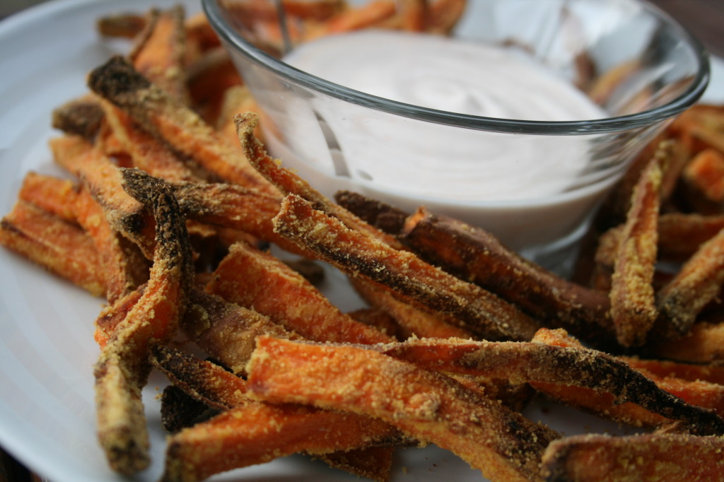 Yam fries in restaurants have crispy coatings that can’t quite be replicated by baking yam wedges with just salt and spices at home. However, adding in some cornmeal or corn flour can come close to copying the commercial versions, without the frying and addition of processed sugar and other additives. Cornmeal has larger granules and in the end the fries are a bit crispier, corn flour has smaller granules so it coats the yams better but they do no end up quite as crispy (I used corn flour for this batch so that is what the photos depict). This version is very simple but you can toss in a few dashes of cinnamon, brown sugar, paprika, cayenne, cumin, or any other spices that you like to make them even more flavorful. Plain, full-fat Greek yogurt is great to use as a base for an accompanying dip, it has lots of protein and being a fermented food it helps to balance out the intestinal flora with strains of good probiotics. Like with the fries you can get pretty fancy with some added spices and fresh herbs or keep it simple, just adding in some fresh lime juice and whatever hot sauce you have laying around will add in some flavor complexity and balance out the sweetness of the yams.