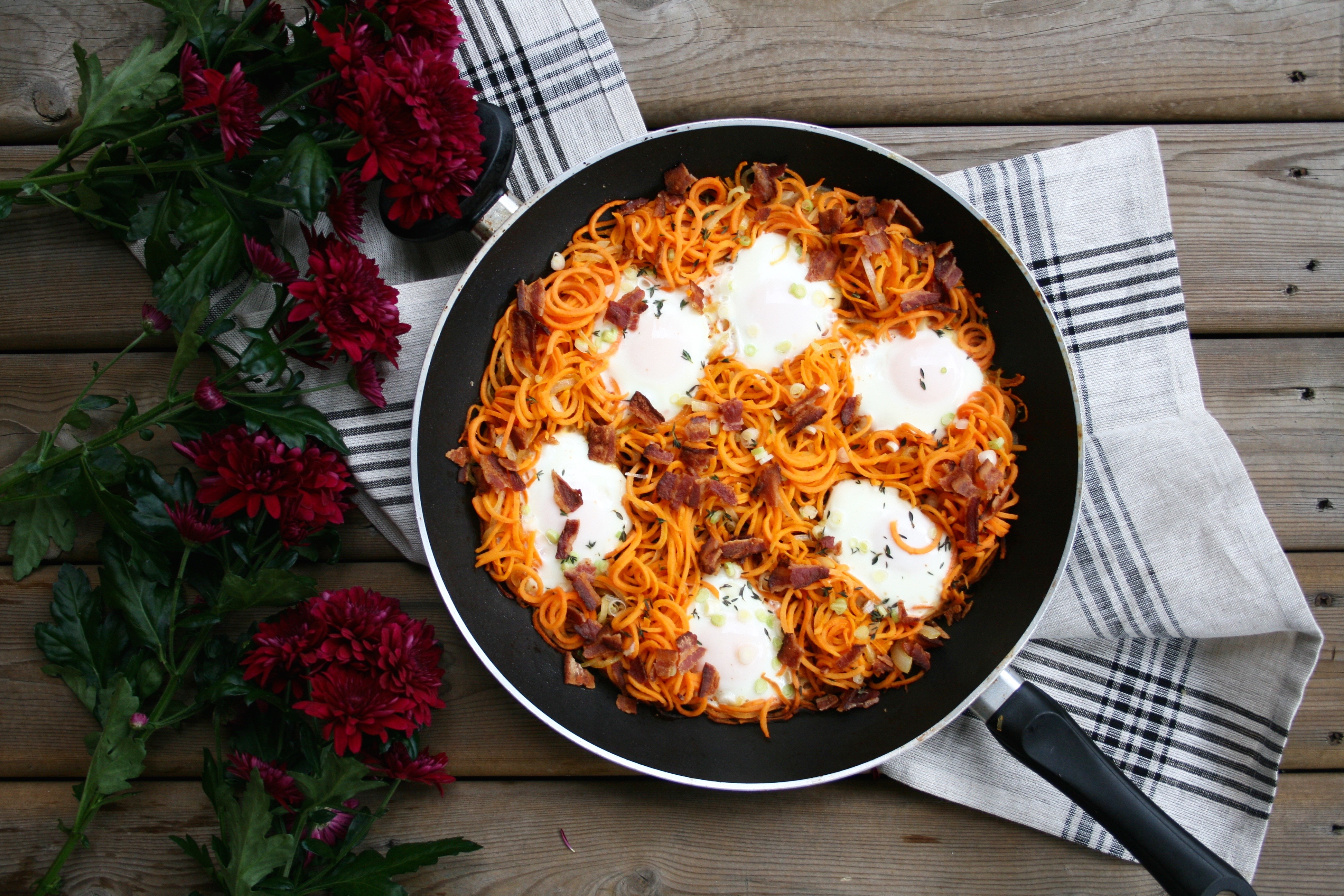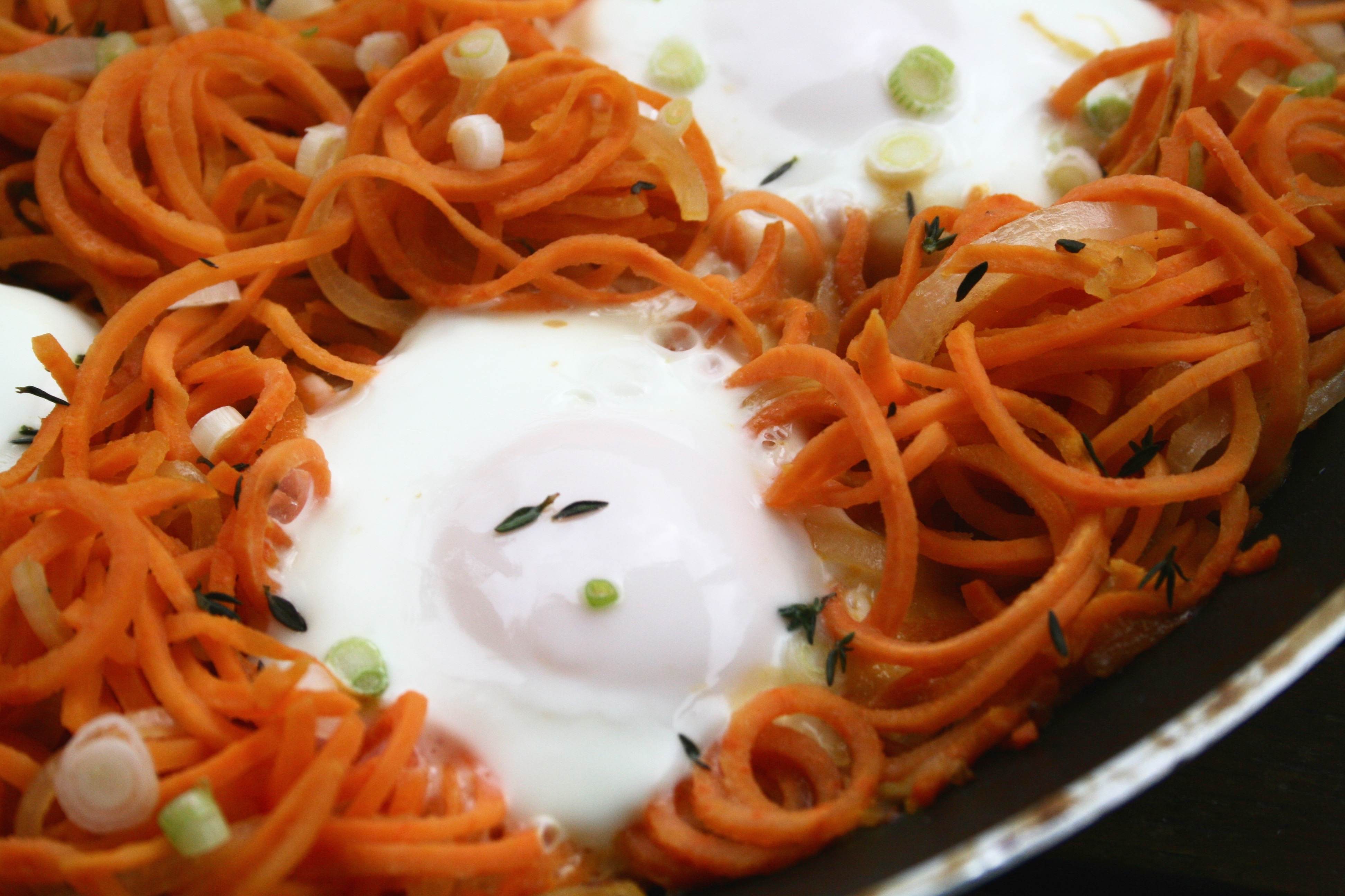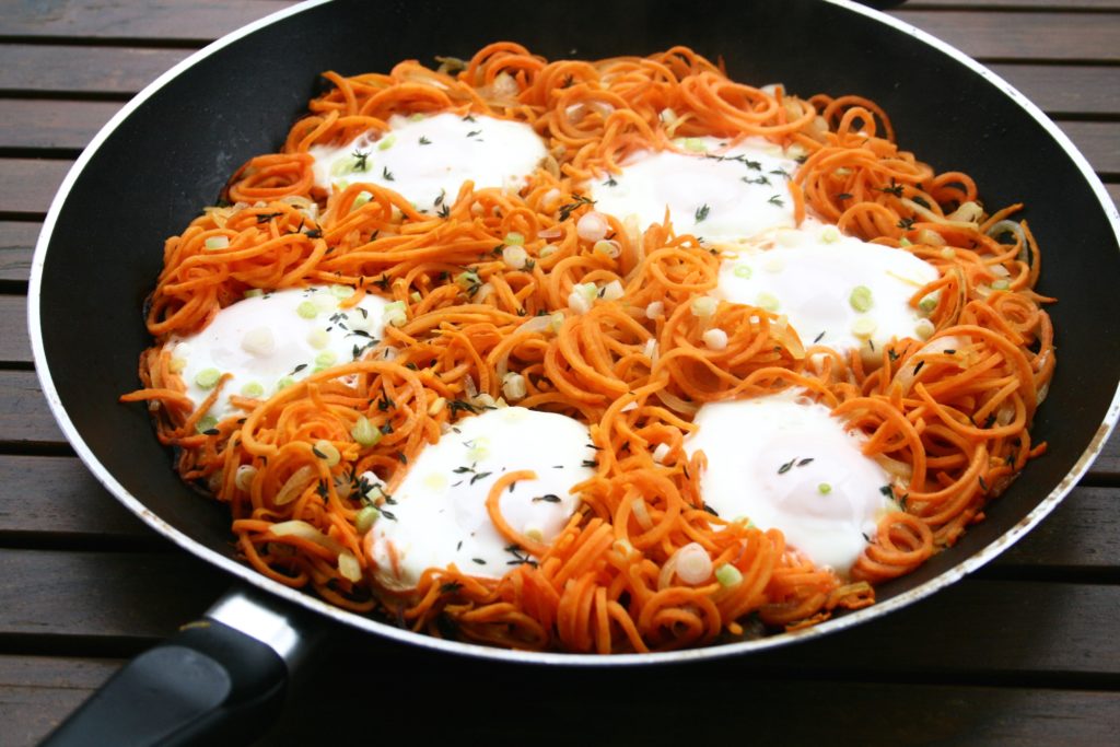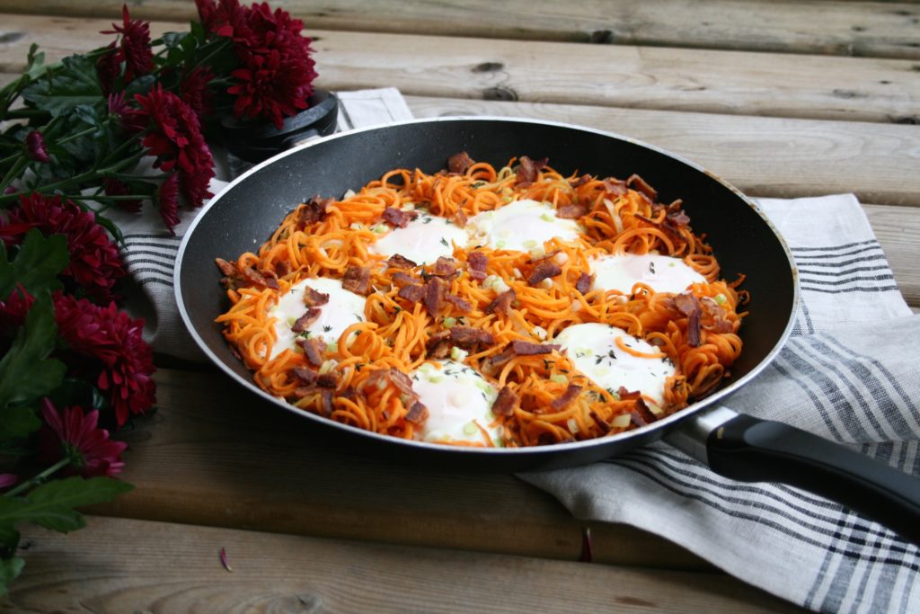 Spiralizing root vegetables is a way to make a slightly different shaped base for egg hash. A spiralizer makes even, thin pieces that cook quickly and uniformly. Here I used yams because of their lightly sweet flavour and smooth, dense texture. Here in Canada we generally call the orange ones yams and the white or cream coloured ones sweet potatoes, but in the US it is the other way around- a great cause of confusion.  Their bright orange colour gives away one of their most prevalent nutrients, beta-carotene, which is important for healthy eyes and a strong immune system. It is a plant pigment responsible for the bright orange of yams, butternut squash and carrots and it is a helpful antioxidant and precursor to vitamin A. I have found that a cooking root vegetable noodles is much easier in a pan on the stove than in the oven. It needs a fair amount of stirring around to cook evenly and that’s just more efficient when closer at hand. Another helper is spray oil, it controls the amount and distribution so it is easy to add an even layer and then add more if needed. Avocado oil is my favourite choice for health reasons. It doesn’t taste as good as olive oil but it has a much higher smoking point. Whenever you have a pan of oil and smoke is coming off (not steam from water dense foods) that means that the oil has been heated past its smoking point. It then goes from being a good source of antioxidants and unsaturated fats to being rancid and oxidized. It goes from supporting us all the way on a cellular level to being potentially harmful on a cellular level. Health food stores should definitely have avocado in spray canisters but I have also seen it more and more in regular grocery stores too, down the baking aisle. The consumers’ desires drive what is available in stores, and this attention to what kind of fats we use for different methods in the kitchen to support our health as best as possible is a growing and wonderful trend.  This could be a side dish for up to six people at a breakfast or brunch with many other dishes or it can be a whole, filling meal for two people.