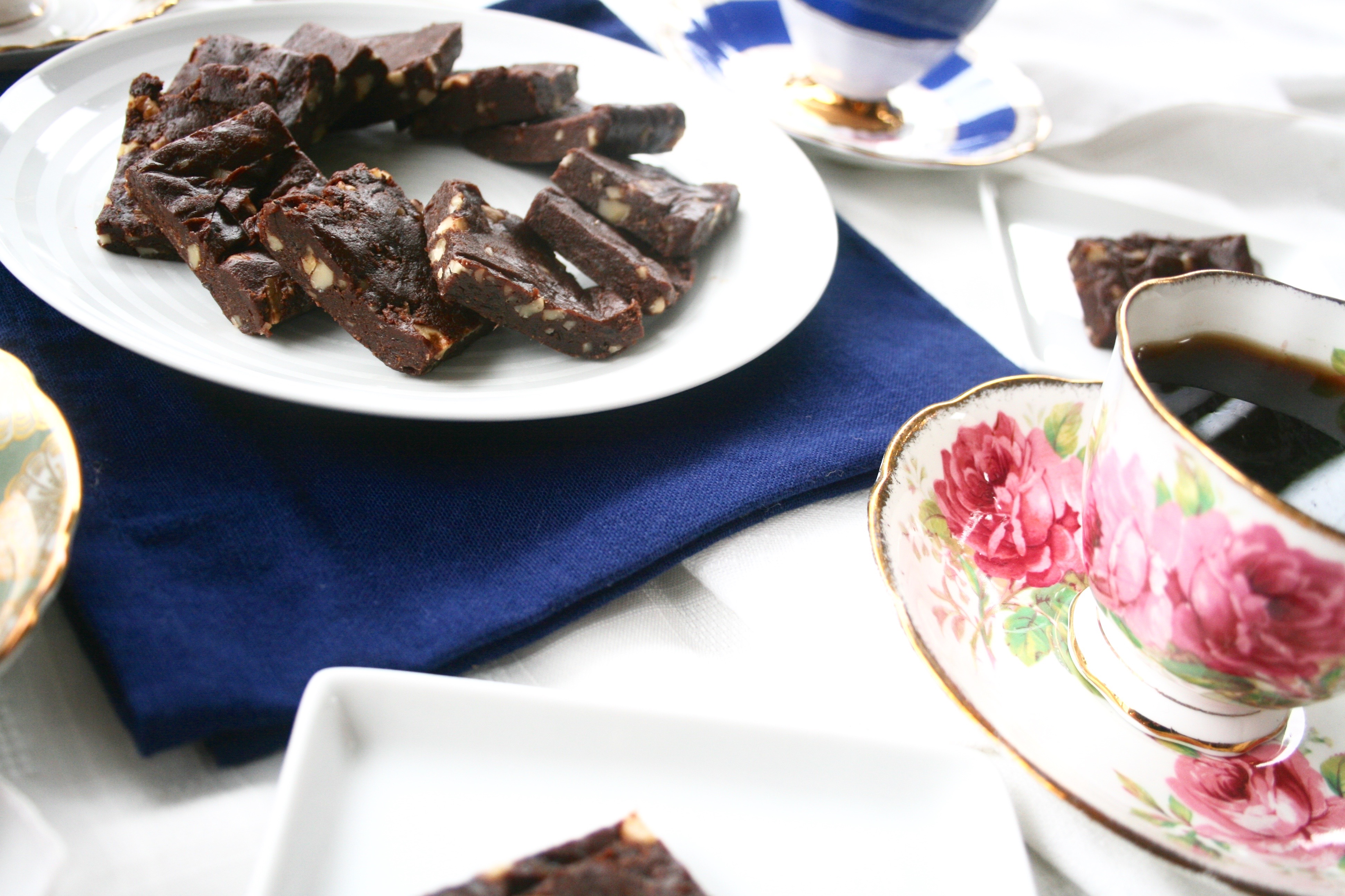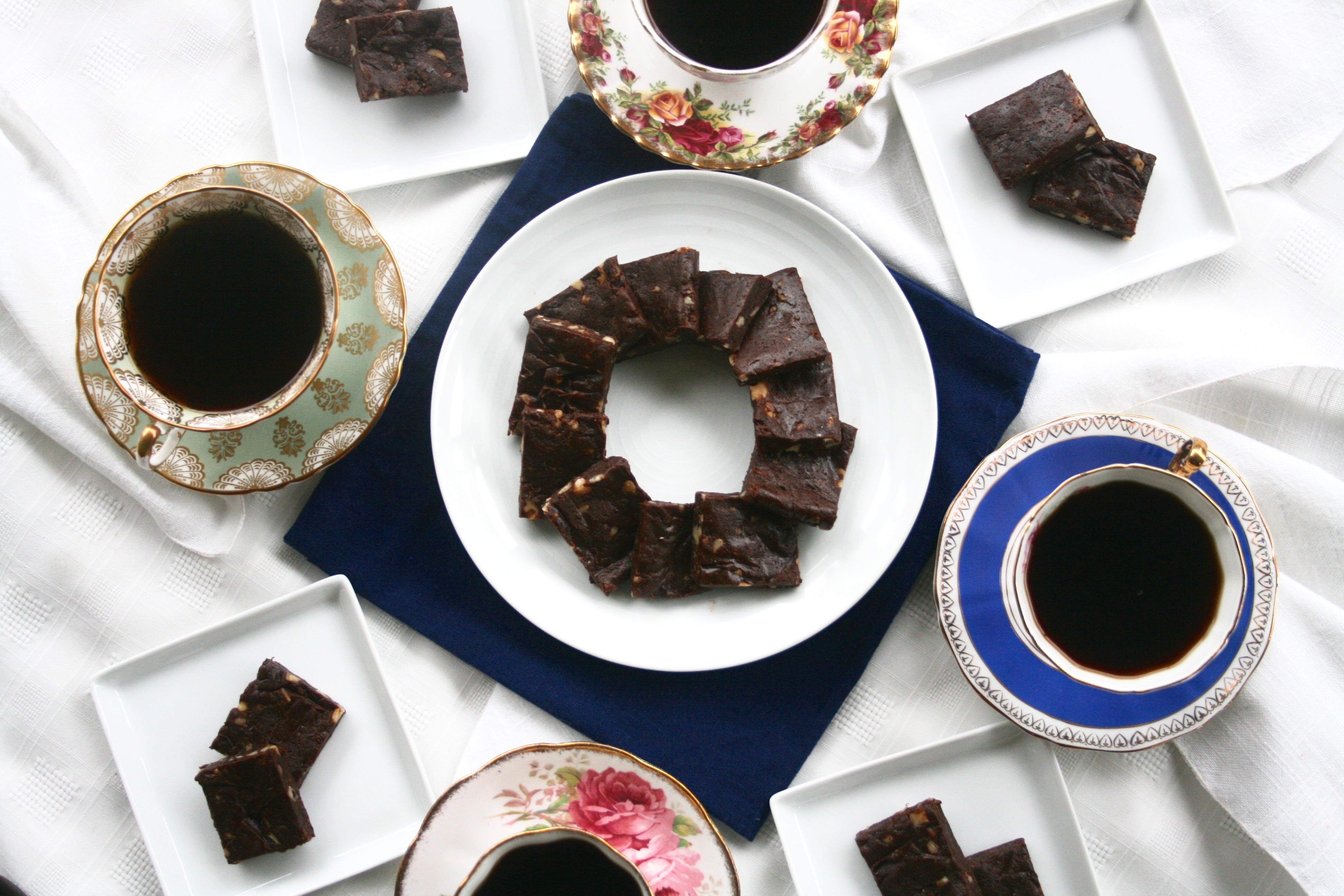 Something even better than coffee or chocolate is both of them together. Neither are touted as health foods but in the right package they can be pretty nutrient dense. A non-traditional brownie like this based off of dates and nuts is full of fiber, antioxidants, vitamins, minerals and healthy fats. I do not believe in intense restrictions or avoiding beloved foods but I think that choosing ingredients as close to their natural state as possible combines the best of both worlds- health and pleasure. Something like this allows for a chocolate fix but does not have ingredients that are really draining for the body like refined (white) flour and sugar.
