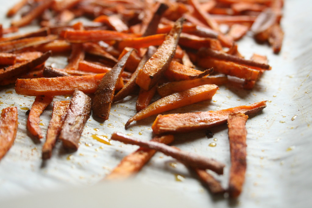 - Preheat oven to 400°. Toss the yams and their accompanying ingredients on a parchment lined baking sheet and bake for 20 minutes, tossing them around halfway through.