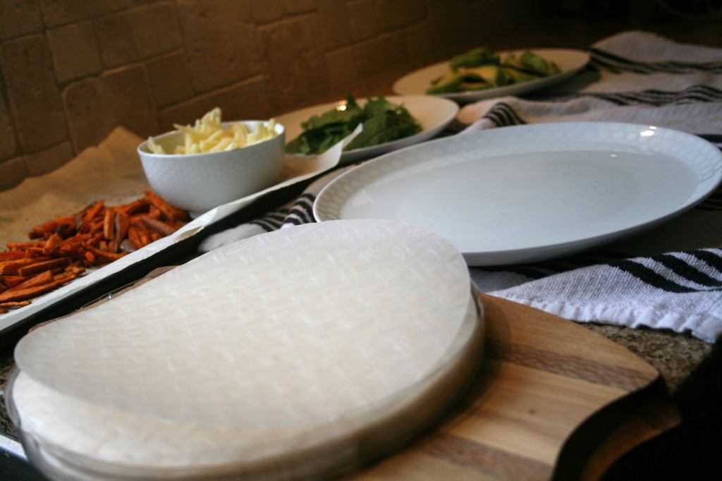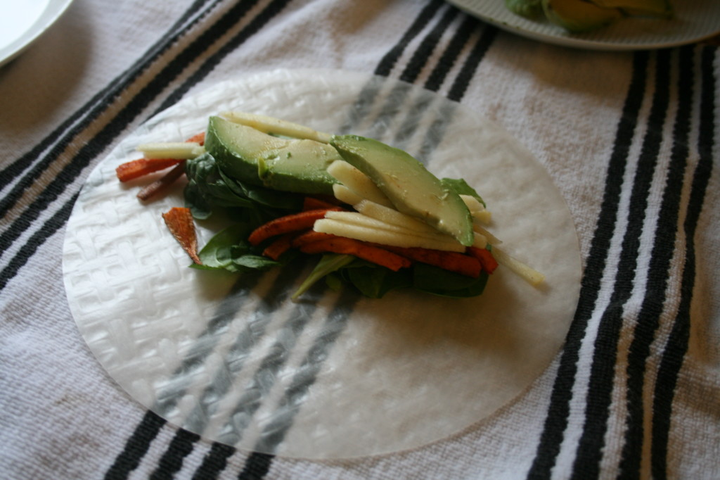 - Once the yams are ready set them aside to cool slightly and arrange your station. The rolls have to be made one at a time and made quickly. Start by fully submerging the first rice paper sheet in a large plate of water for 4-5 seconds then place it on a kitchen towel. Layer ⅙ of the filling ingredients in the middle of the sheet and flip the bottom over, then the sides and finally roll the filled bottom part to the top edge. Be sure to make the folds as tight as possible. The rice paper will continue to get softer once it is out of the water so work quickly. It should stick to itself very easily, if not use your fingers to rub a bit more water along the exposed surface and it will soften up and become more pliable in a matter of seconds. Repeat for the remaining rolls and roll them over when plating so the side that started as the bottom is now the top.
