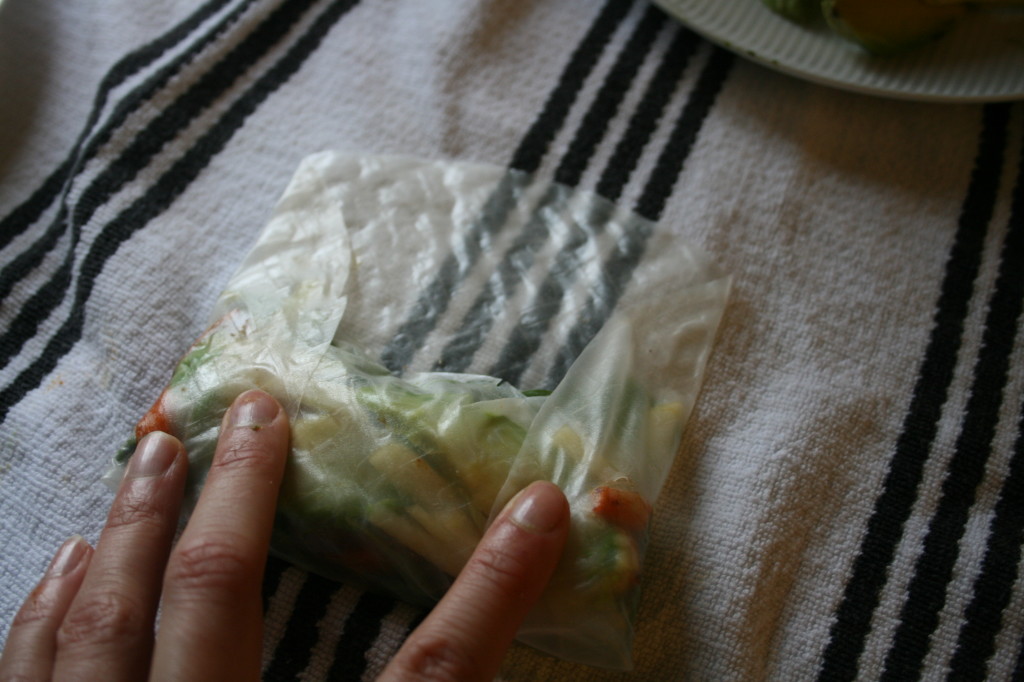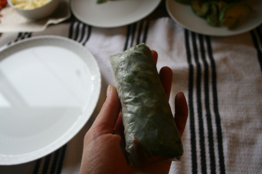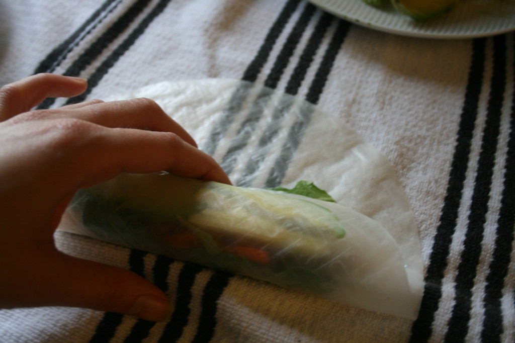 Step 5: Roll the bottom side with the filling up to the top edge, flip over and ta da, professionally wrapped spring rolls