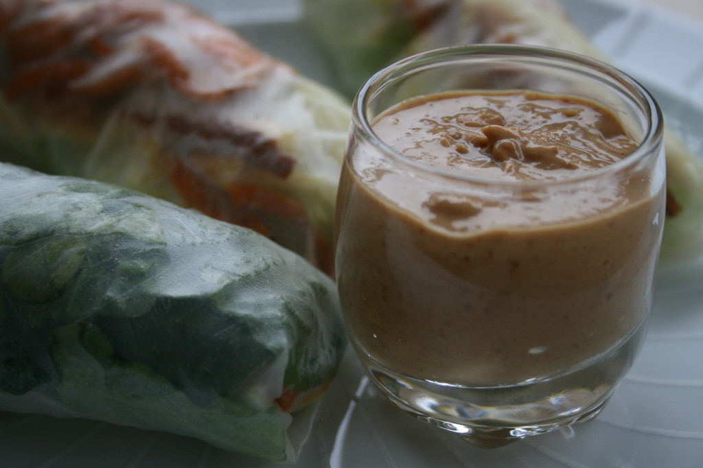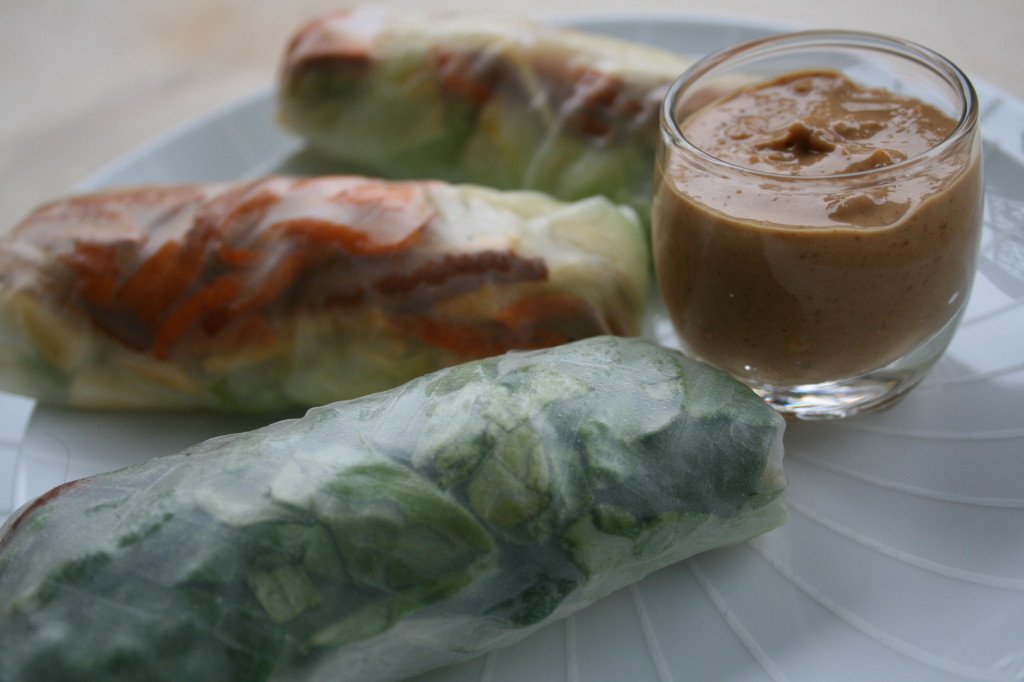 If you think that fresh, non-deep fried spring rolls look kind of gross and potentially slimy, I get you. I have watched friends snack on these for years without any desire to try them myself, even though they are a very versatile way to eat more vegetables and use up scraps and leftovers. Then, the other day in the grocery store I saw the wrappers and had an uncontrollable urge to try them. Since there is pretty much no healthy food that I don’t like I realized my affront to these is probably unwarranted. Well, they turned out to be ever better than I expected! That being said, a very flavorful dipping sauce is what makes these, without it they would be like a plain salad without any dressing. These ones in particular combine some fall produce with a creamy peanut dressing that has a bit of spice, sweetness and tartness. This time of year if I am going to have a vegetarian meal like this with lots of raw produce I like to use some roasted root vegetables, yams in this case, to make it more filling and grounding. Altogether these rolls provide lots of complex carbohydrates and fiber with some healthy fats and a wide range of vitamins and minerals but if you want to up the protein you could throw in some cooked prawns or thinly sliced cooked chicken or turkey. For lunch this amount could serve two people but as appetizers it could stretch to feed 3 or 6 people.