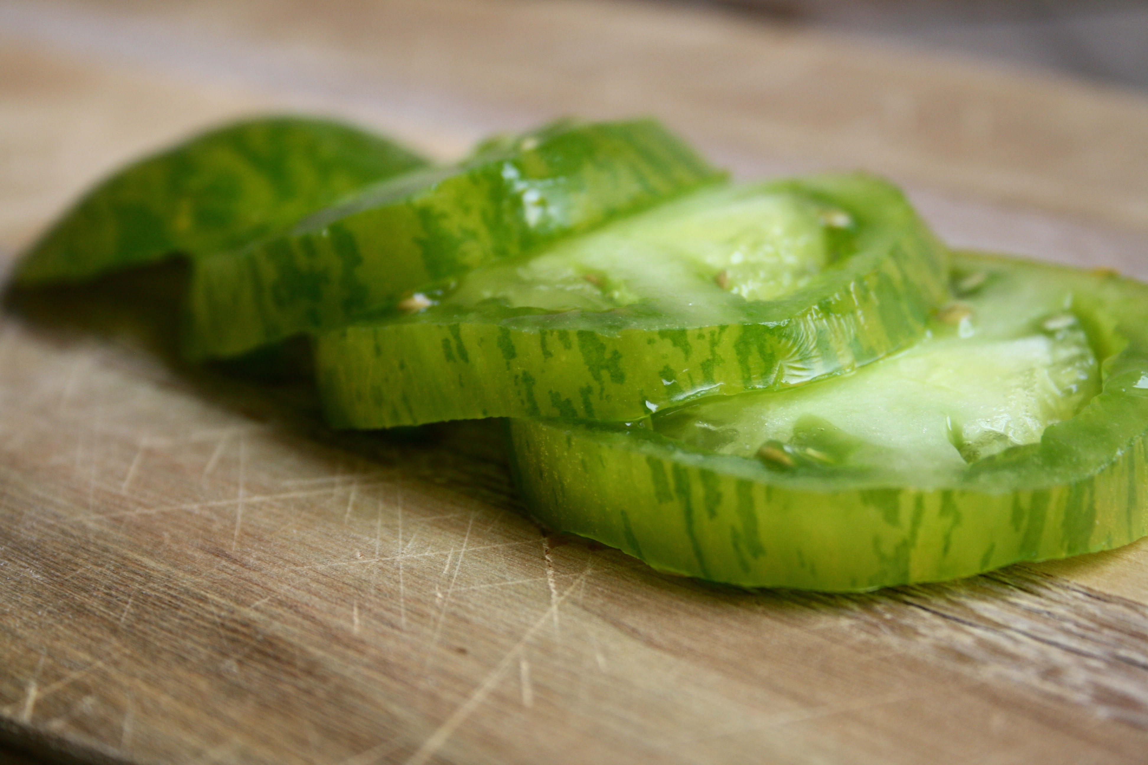 These marbled green tomatoes are a fully ripened heirloom variety with a delicate flesh and sweet, mild flavour. This time of year they are increasingly available at farmers’ and produce markets and even at regular grocers.
