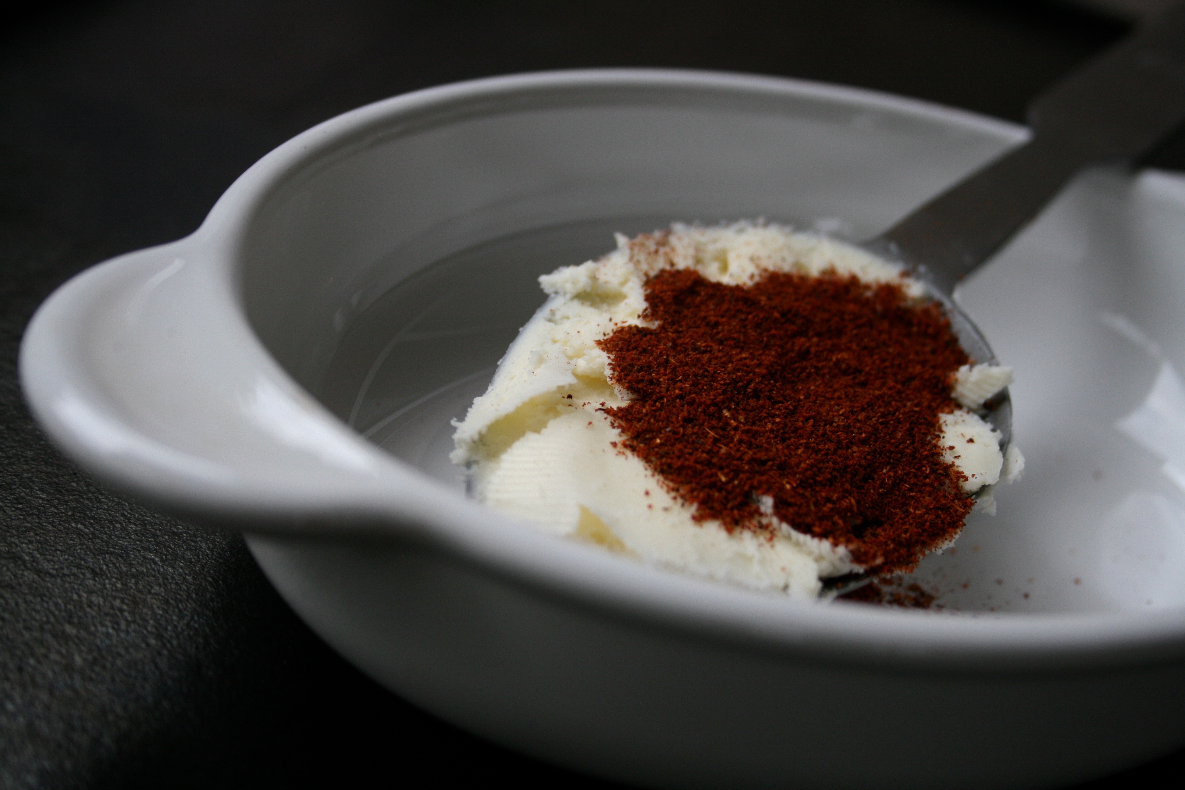 - Place the butter and chili powder in an oven proof container and place in a hot oven (preheated to 325°) until melted, up to 5 minutes or so. Remove and whisk it around so that the spices are evenly distributed, then pour into small silicone containers (mini muffin liners or ice cube trays are ideal). Refrigerate until it hardens up, allowing at least 3-4 hours. The butter can also be melted in a skillet over the stove or in the microwave but be careful that it does not get hot enough to boil or burn, both of which have negative effects on the flavour. And it can be strained right after it's melted for a more professional looking, evenly coloured butter.