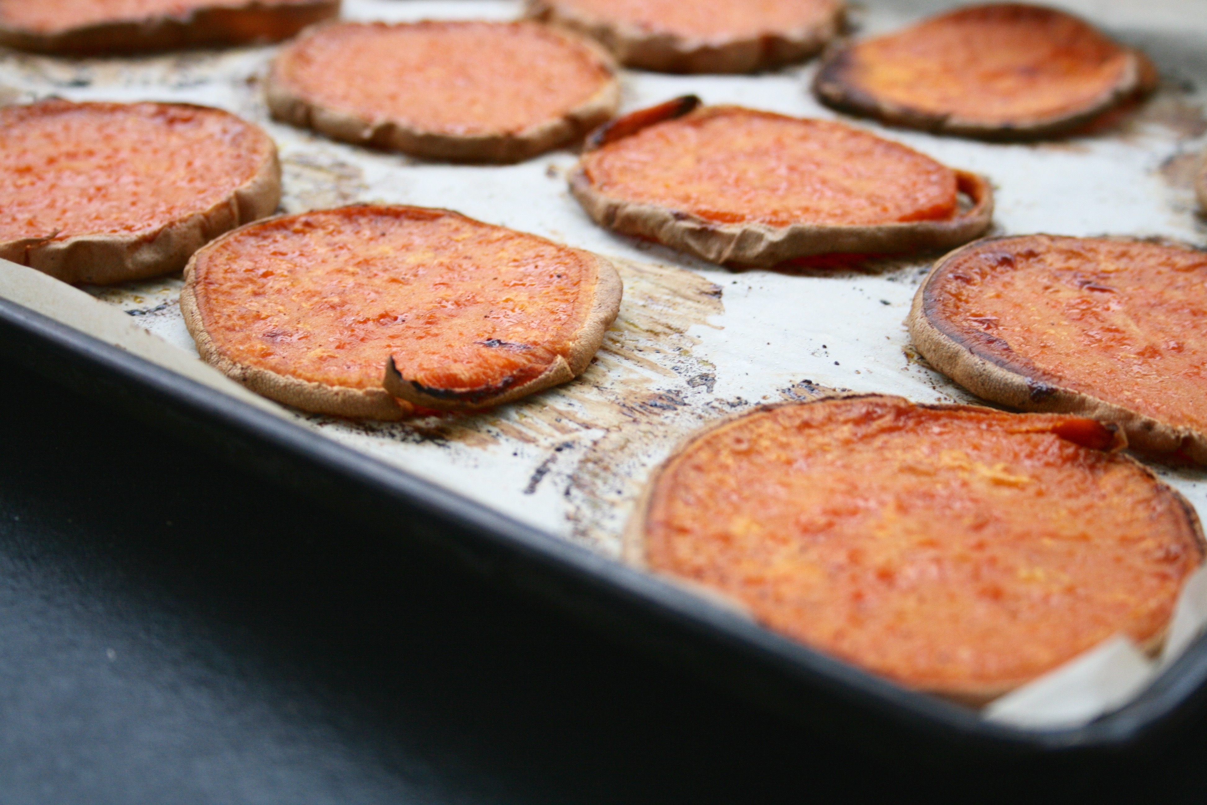 Roasted yam rounds are a good substitute for crackers, bread or chips as the base of an appetizer or snack. They are warm and nourishing, easy to digest, dense, sweet and filling because of the complex carbs they contain. Simply slice a yam into thin pieces, roast until the desired crispness is reached and then top and serve. Generally, cutting the yam into 1/4 inch thickness makes for a thick and sturdy base but cutting it thinner reduces roasting time and makes them crispier and more like chips, which can be better if not serving right away because they are fine at room temperature, whereas thicker pieces are better served hot.