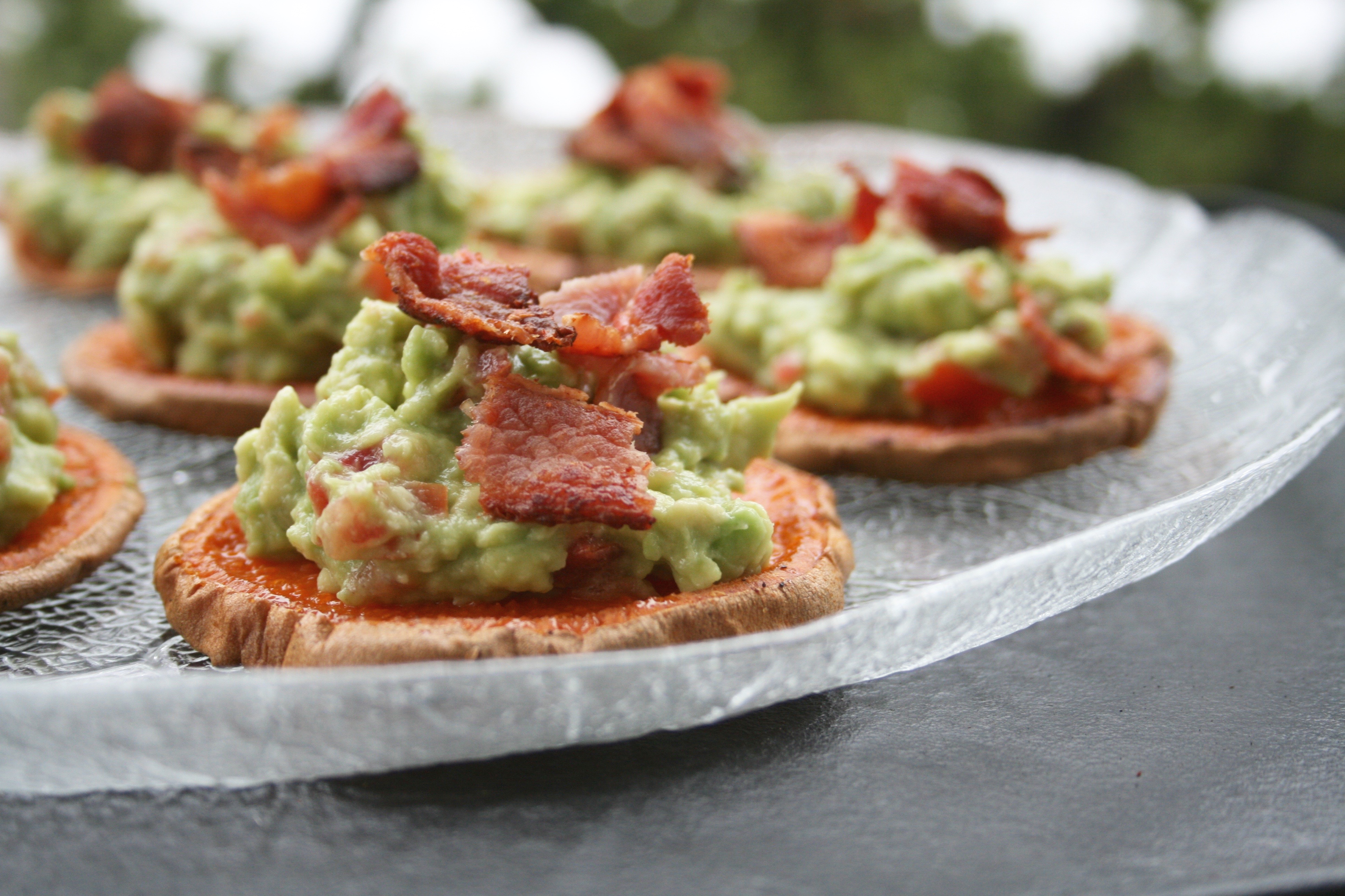 - Remove the yams from the oven, transfer to a serving platter then top each with a spoonful of guacamole and optionally, a few pieces of bacon.