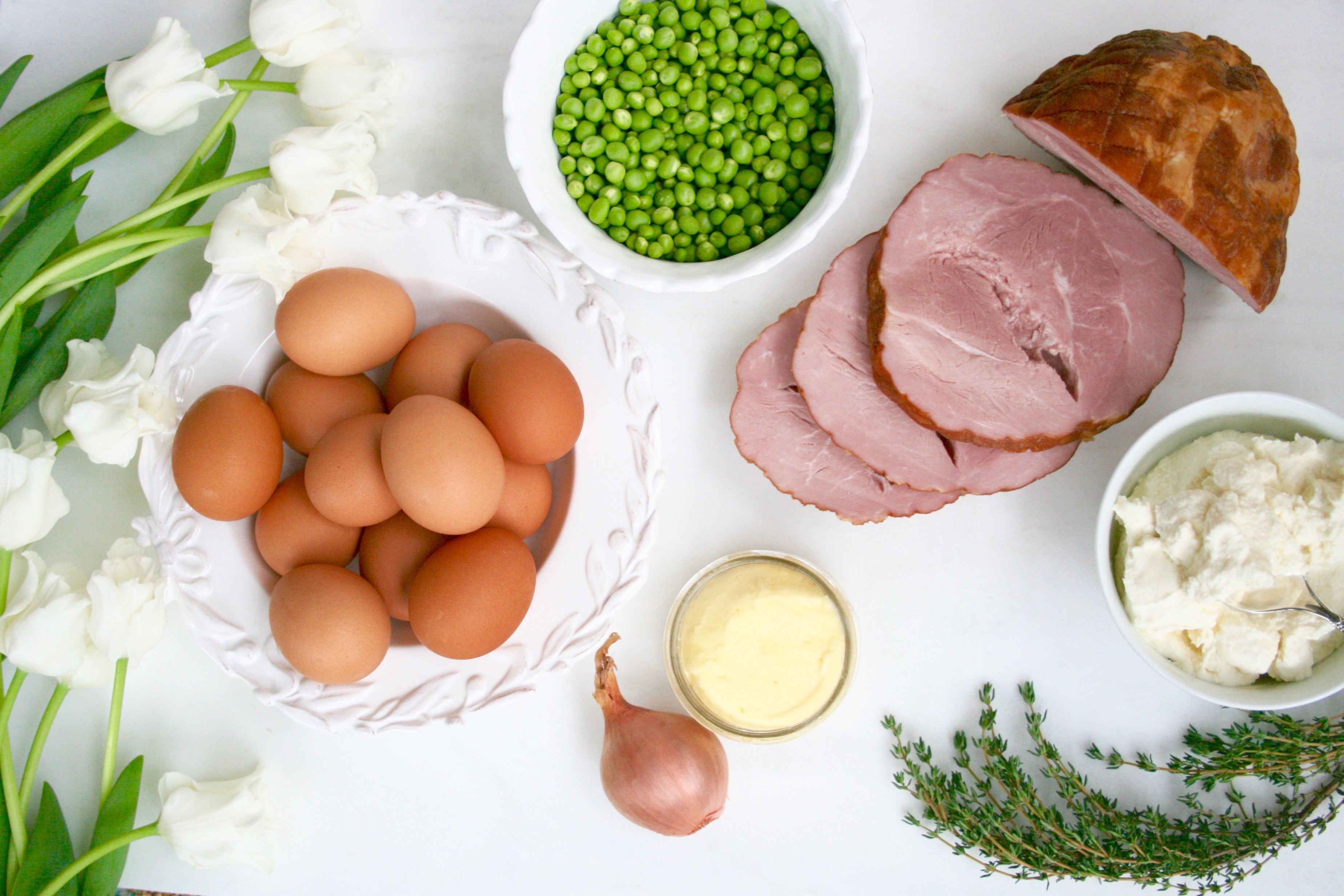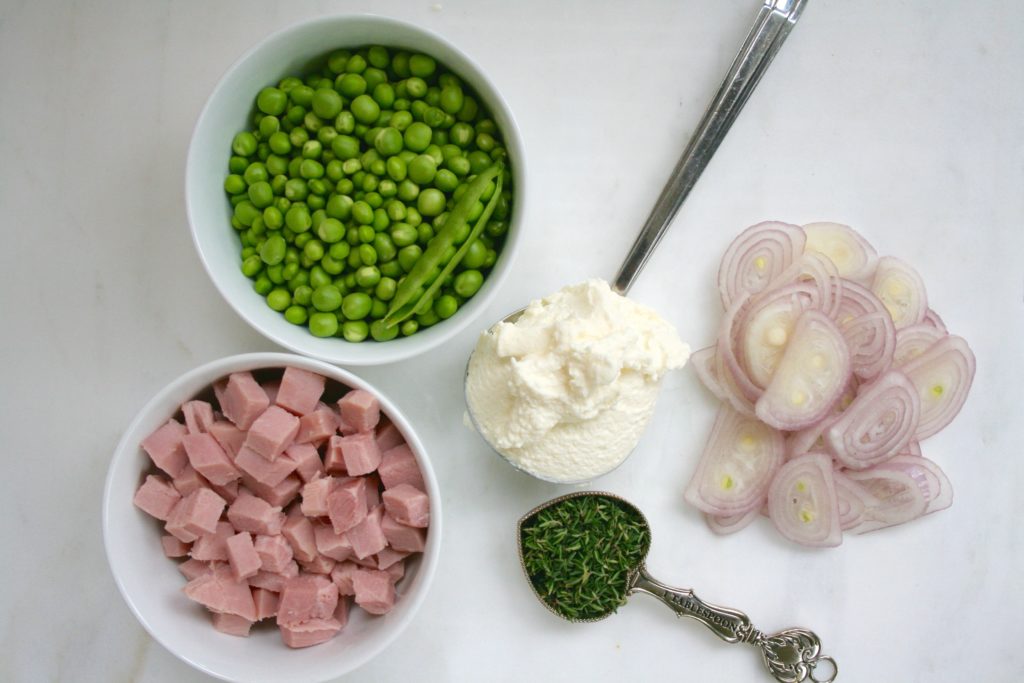 - Blend the eggs, marscapone, thyme and salt with a regular or immersion blender until smooth. Pour it into a bowl and mix in the ham, peas and shallots until evenly combined.