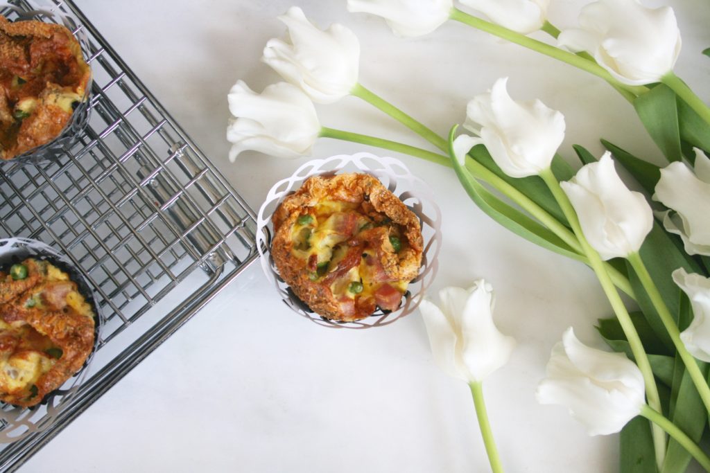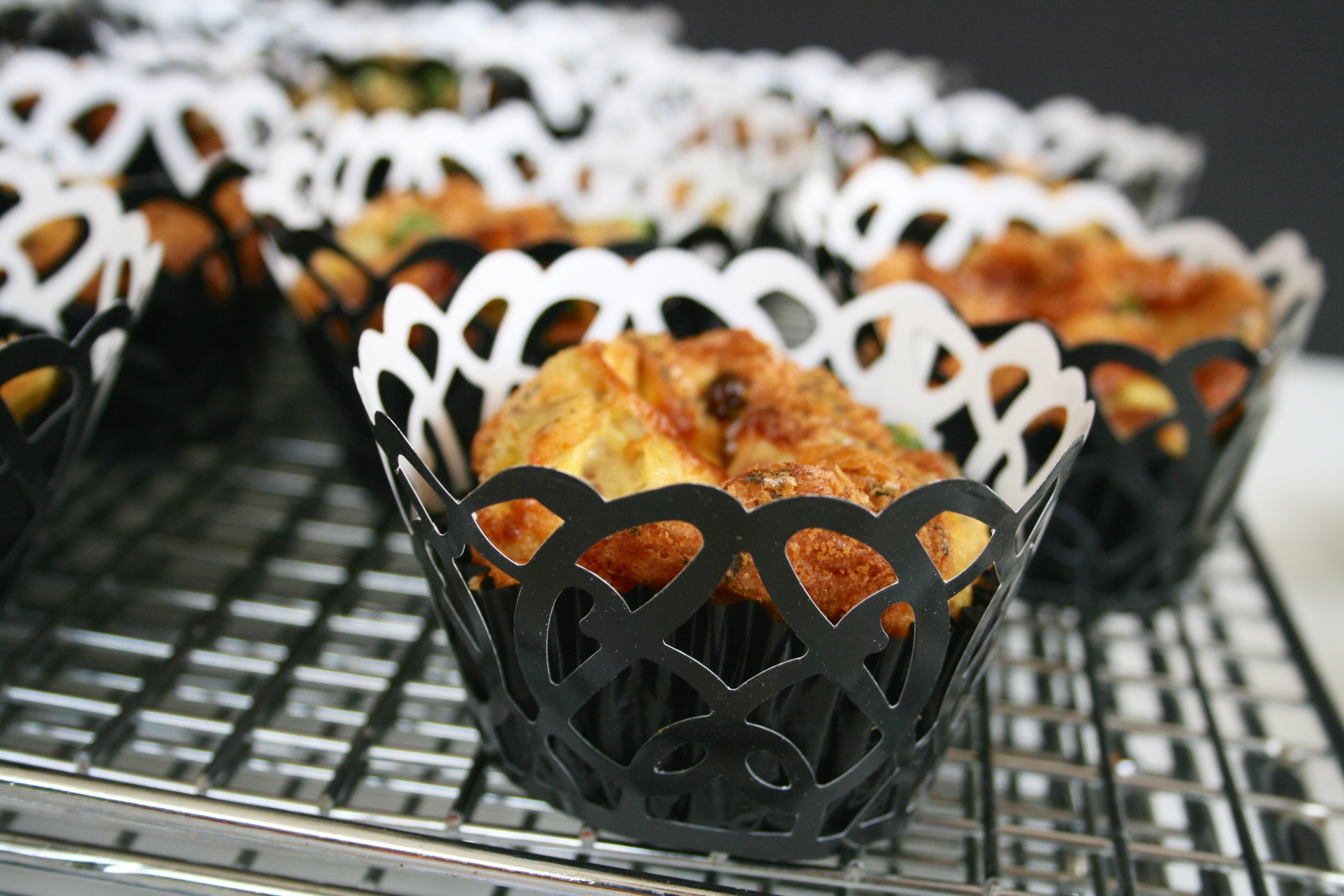 Frittatas are wonderful for many reasons, including that they are healthy, can be a great way to use up leftovers, are very flexible according to preferred tastes, and they are pretty easy to throw together… but they are not the most beautiful. While their rustic look can be part of their charm, if you want to make them a bit fancier for an Easter brunch or other special occasion, I recommend using colourful muffin (or cupcake) liners and decorative embellishments. Here, I used dark black liners from a specialty baking store and cupcake wrappers from a craft store. Any large craft or baking store, or even grocers with a large bakery section, should have extra special options like this, otherwise they can always be found online.