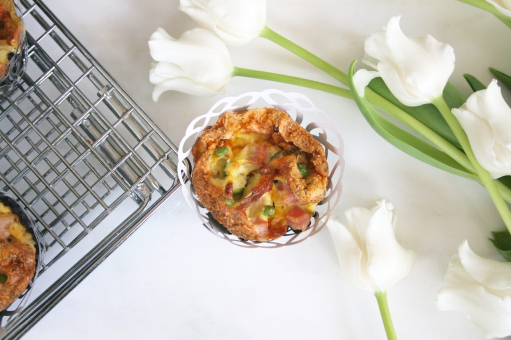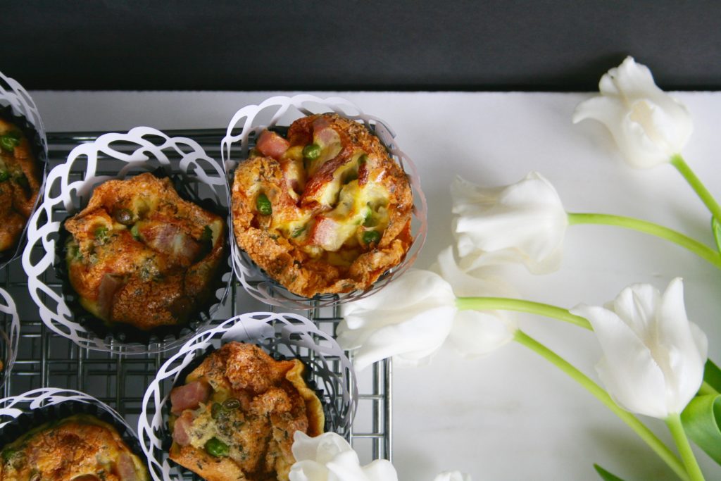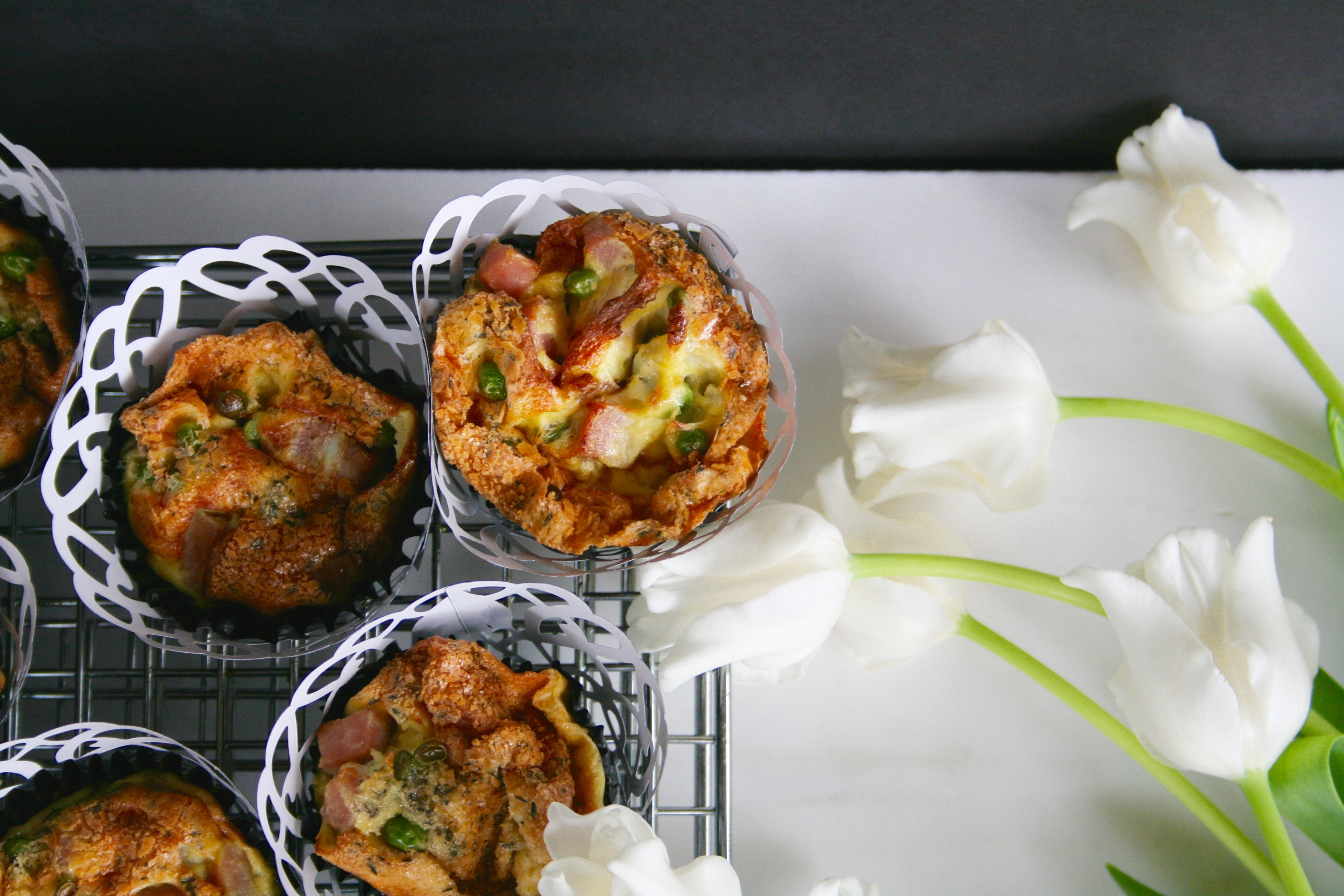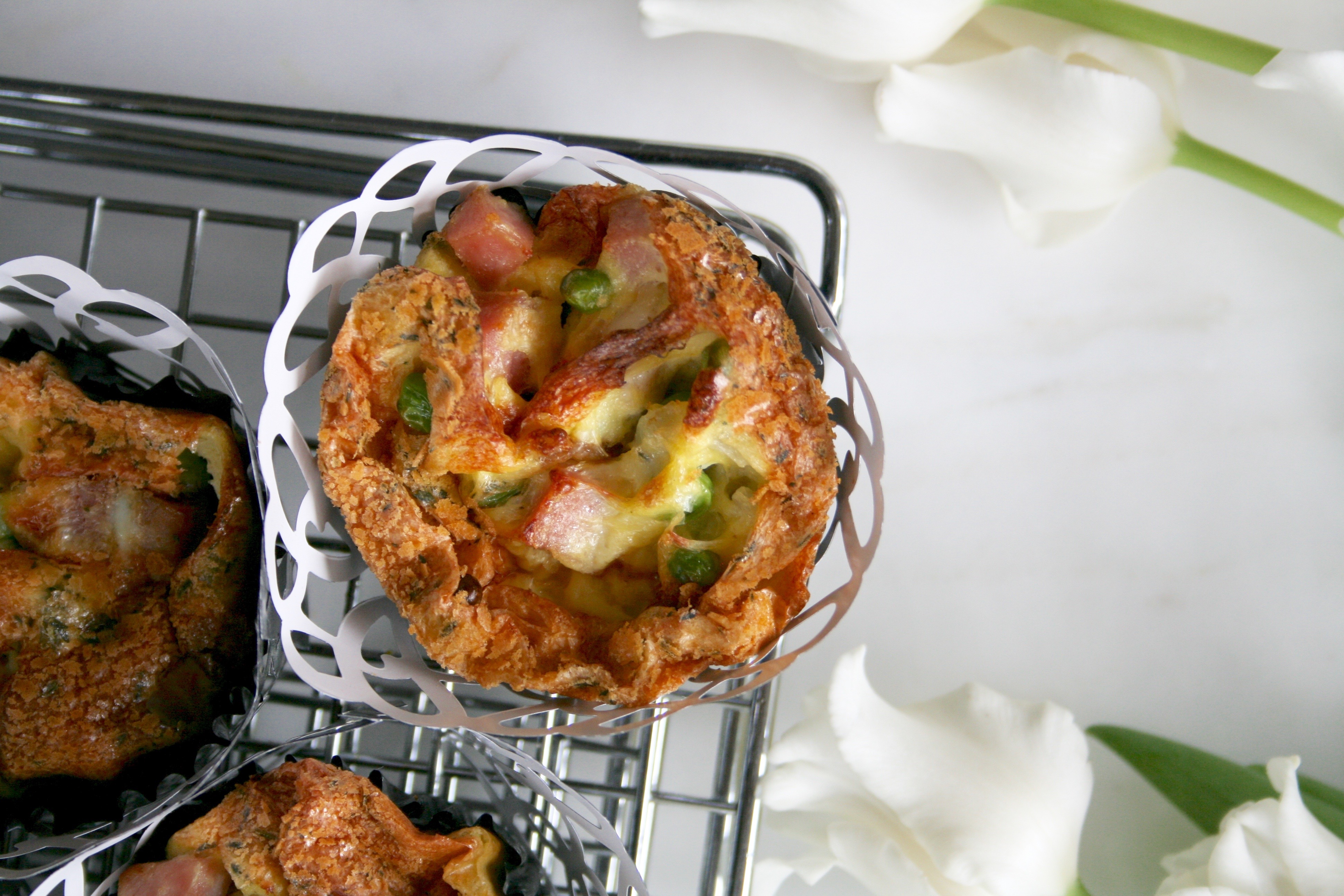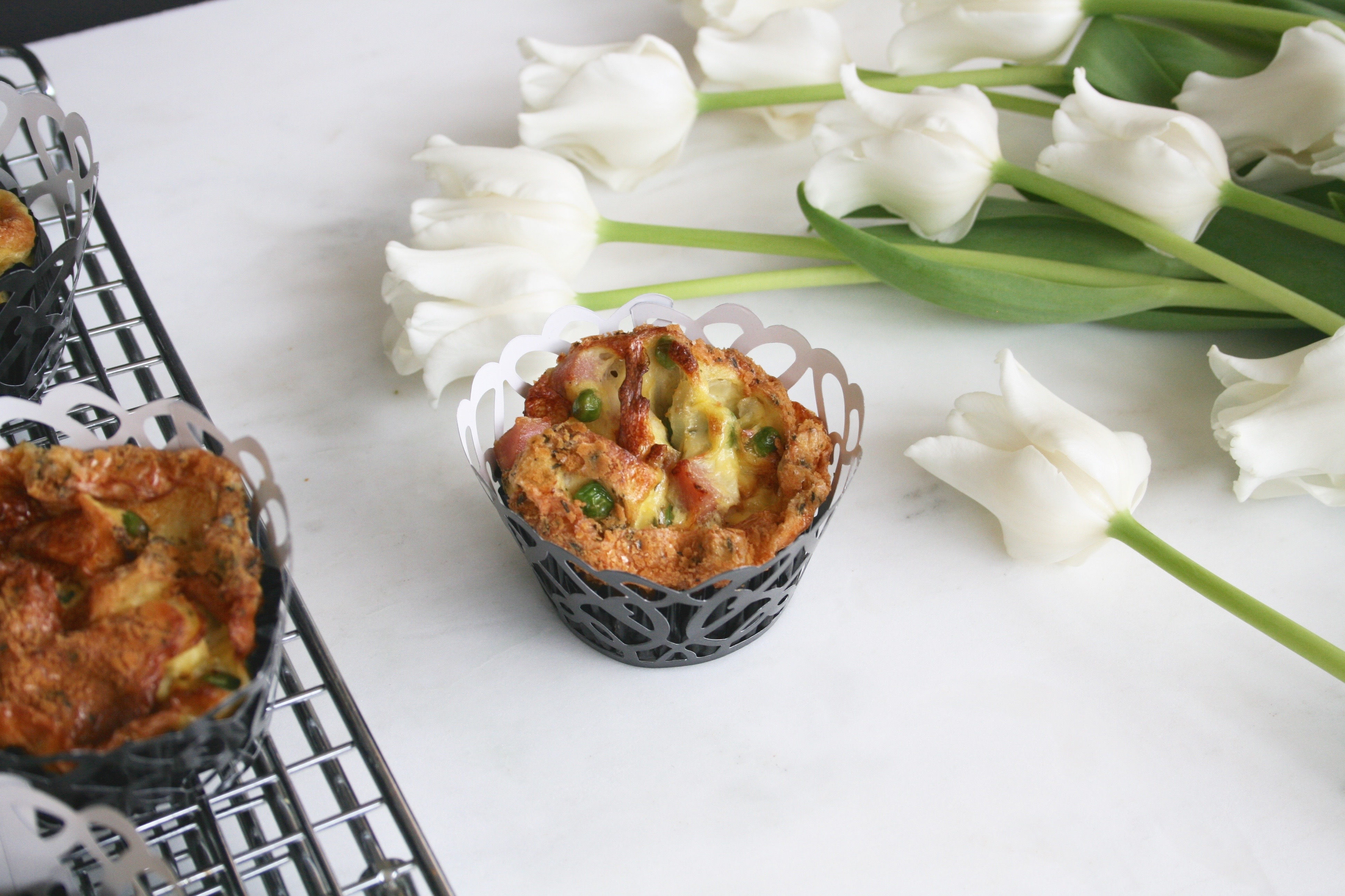 Frittata muffins can appeal to children and adults alike. This seasonal variation has some sweetness from peas, ham and cooked shallots plus some creaminess from marscapone and butter. A bit of thyme adds some flavour without being too exotic. This recipe can either make 18 muffins or it can be put into a greased casserole dish and baked then cut and portioned after.