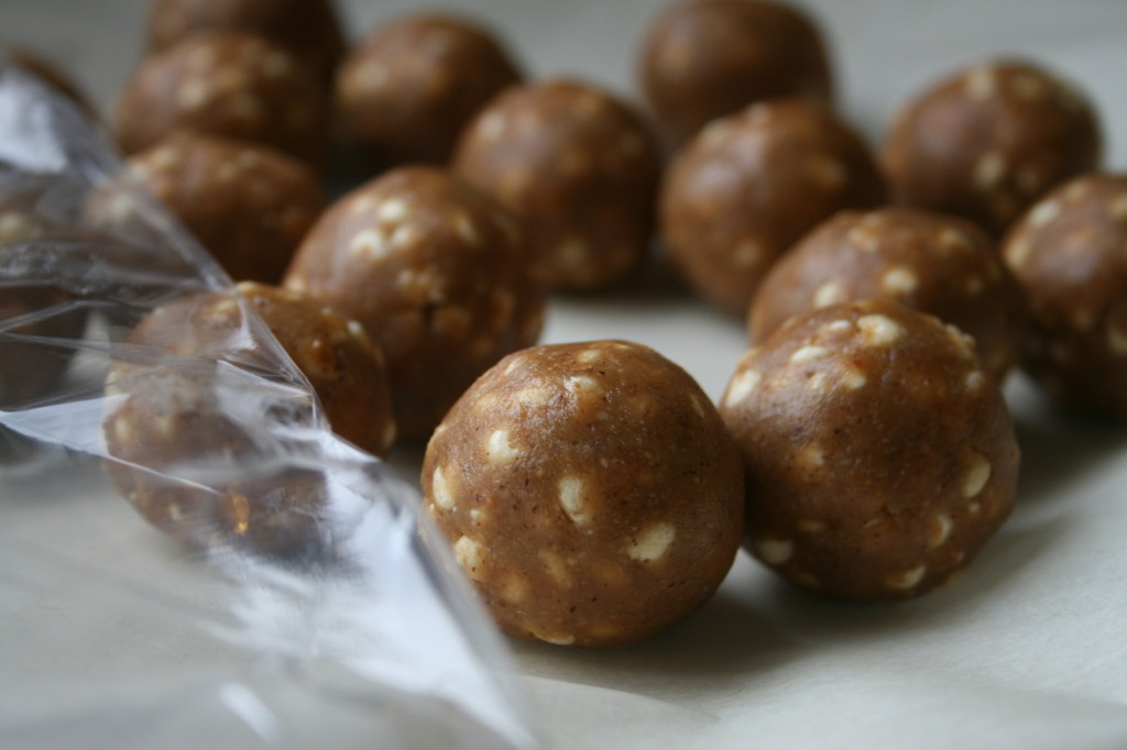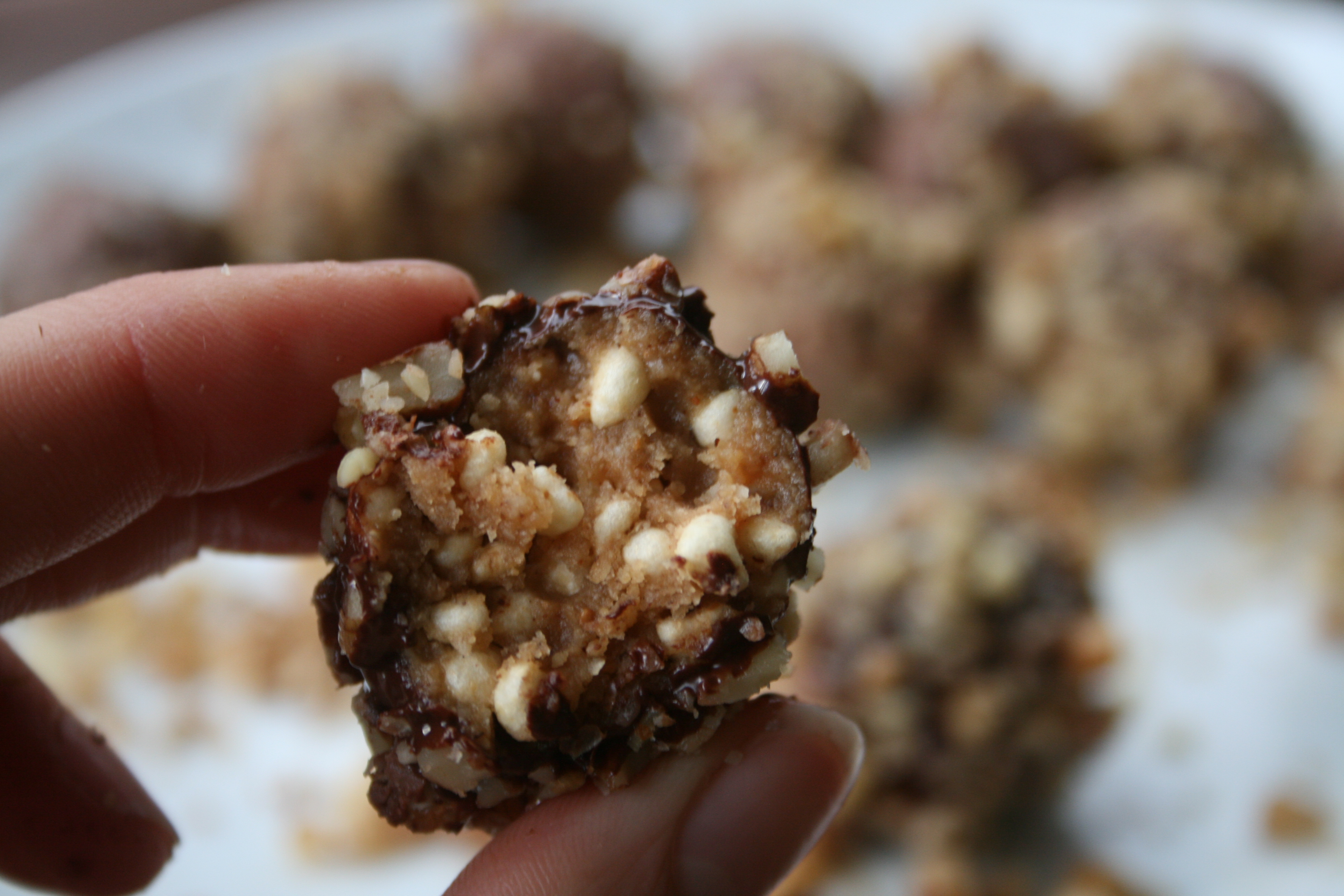 - Mix together the hazelnut butter, almond flour, maple syrup and vanilla extract until fully blended and then mix in the millet puffs. Take 1 tablespoon at a time and roll it between your palms to form a ball. Before melting the chocolate set up the dipping station- place the chopped walnuts on a small plate and then have a clean plate next to it for the final product.