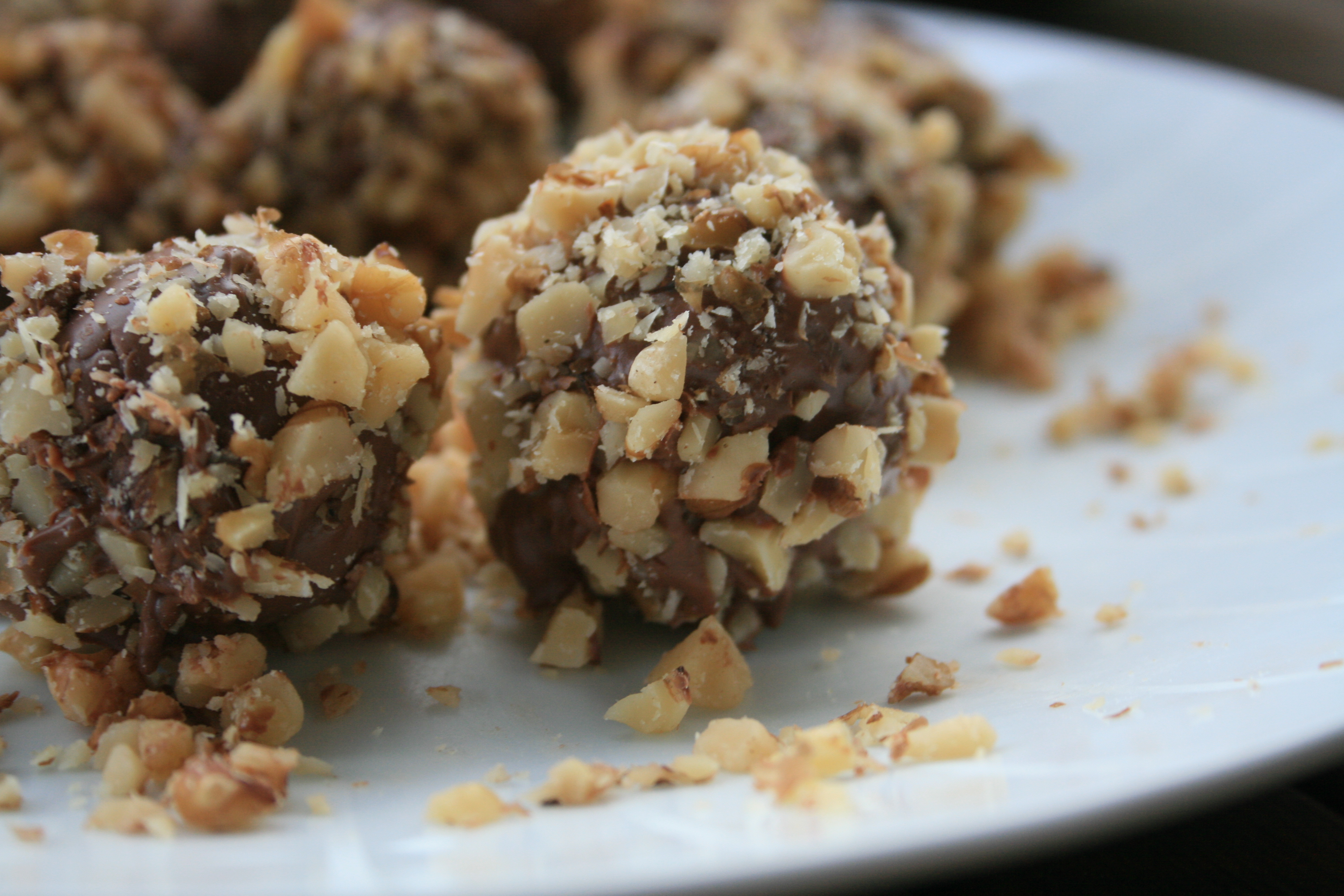 - One by one dip the hazelnut balls in the chocolate, let any excess drip off and then roll them in the chopped walnuts and place on the clean plate. Let them firm up for 20 minutes or so before serving or place in the refrigerator for around 10 minutes to speed up the process.