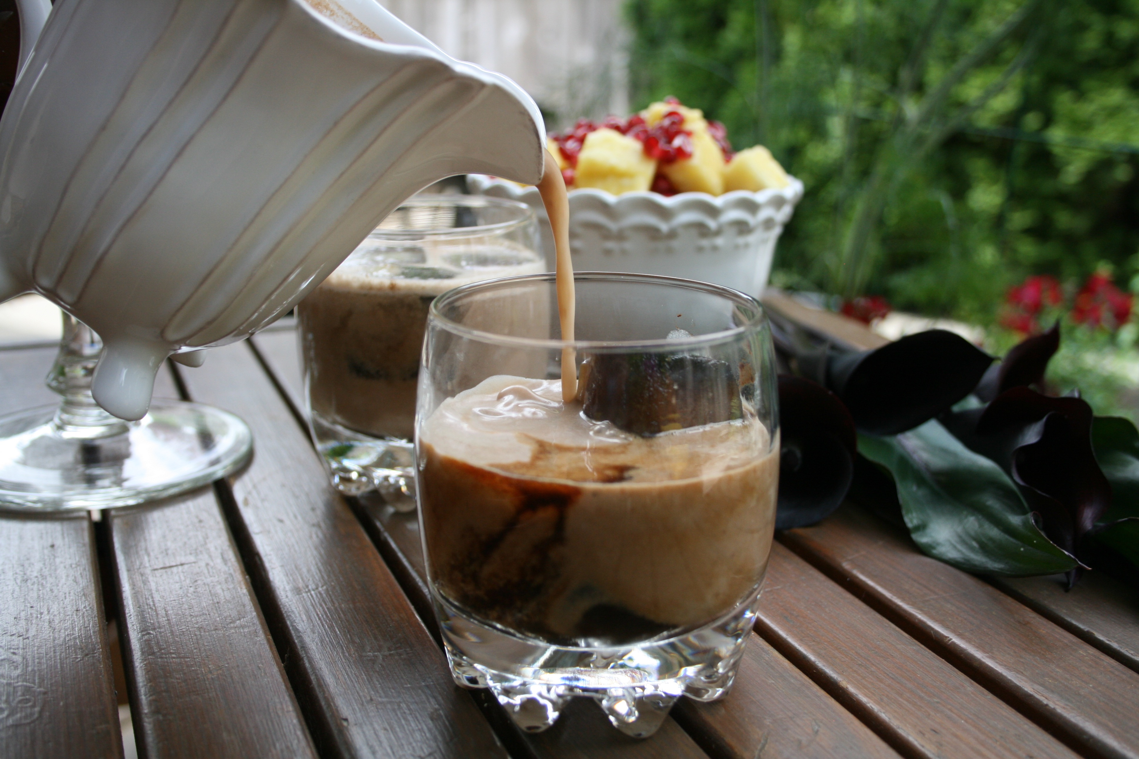 This is a really easy drink to make and the measurements do not have to be precise at all. Small servings like this are made from around 1 cup of coffee frozen into cubes and 1/2 cup of nut milk but it totally comes down to preference.