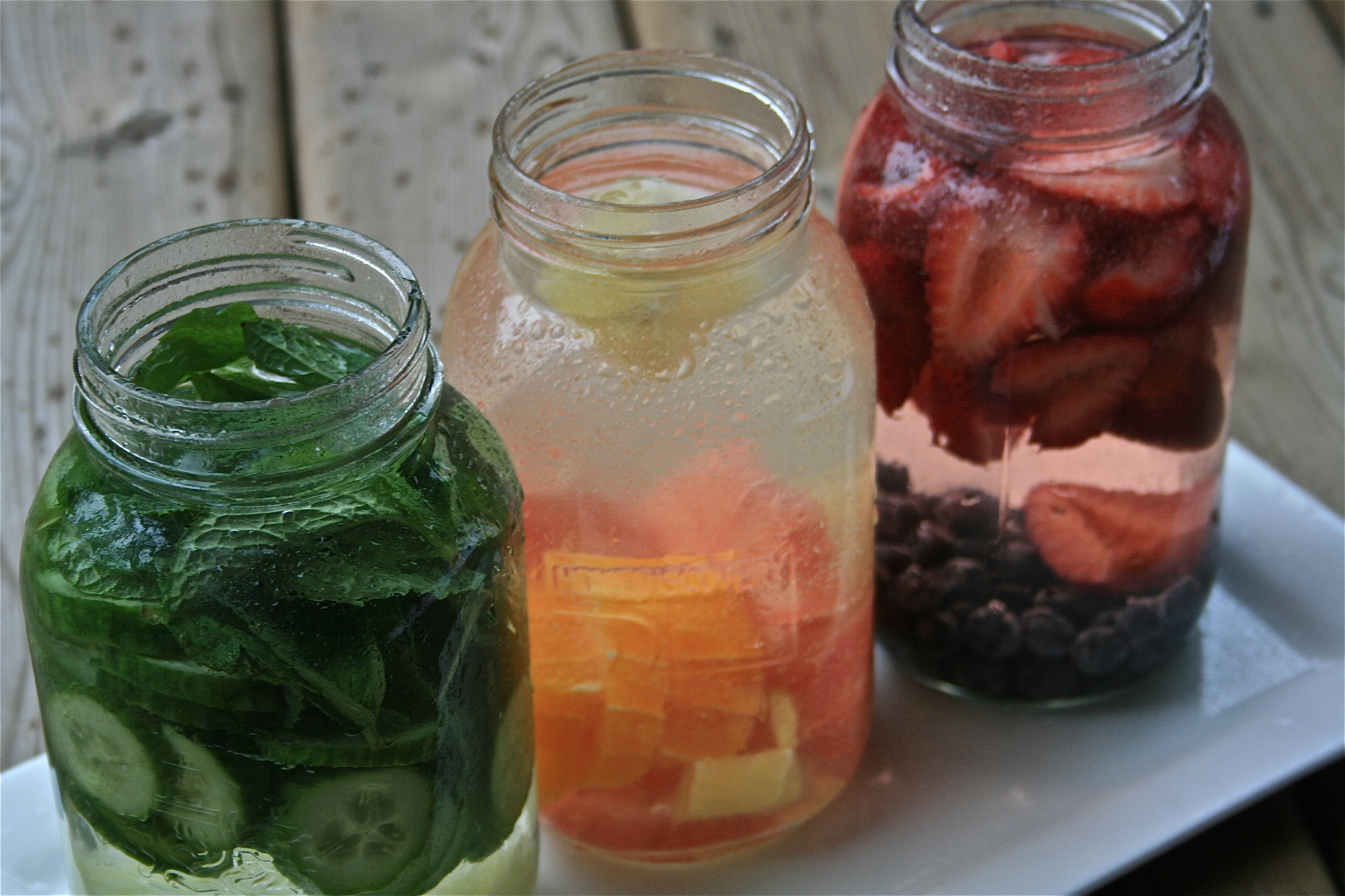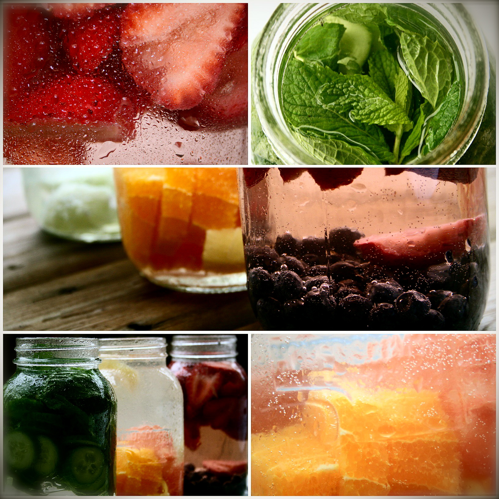 Since water works best when drunk in its natural form (definitely not when transformed into coffee, tea or pop) it is best to aim for that. However, adding in some fruits, vegetables and herbs can increase the nutrients and flavor without robbing any of the benefits. Plus it can make anywhere kind of feel like a fancy spa. I have written out some of my preferred combinations below but there really are no limits. If using citrus fruits it is best to remove the rinds because they can create a bitter taste. Also, if available, go for organic ingredients to fully support your body’s detoxification system and not give it extra pesticides to work through.