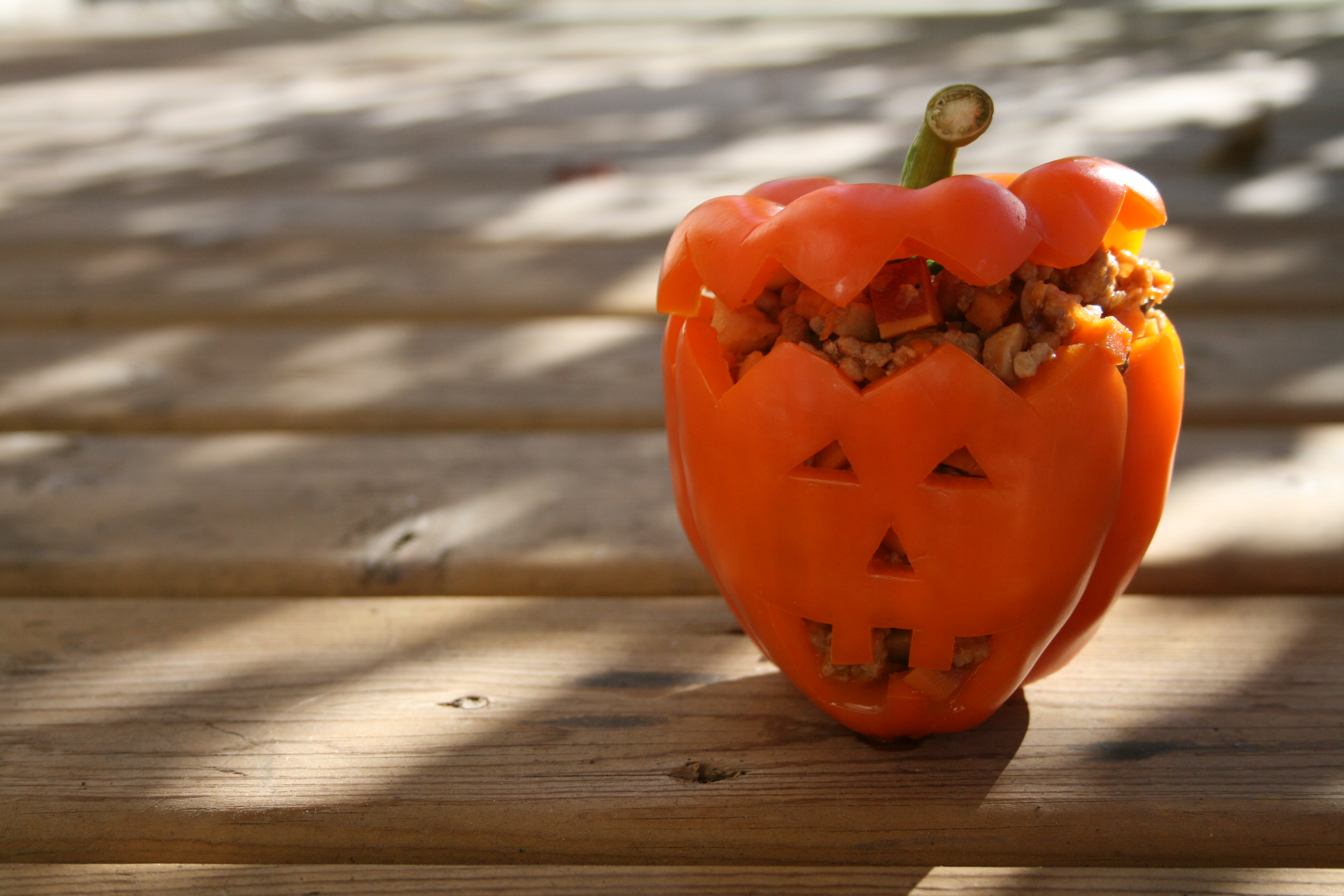 Stuffed peppers are an easy way to use up leftovers and add in an extra vegetable. Any kind of rice dish or chili can be nice for the filling. This time I used ground turkey and snuck in even more vegetables to make this a light but filling dish. Since Halloween is nearly upon us I used orange peppers and cut them into mini jack-o’-lanterns. Some of the best tricks for making kids eat more vegetables are to hide them and make them fun or playful. My brothers are fully grown but I still need to use tricks to get vegetables on their plates and they both seemed excited about these.