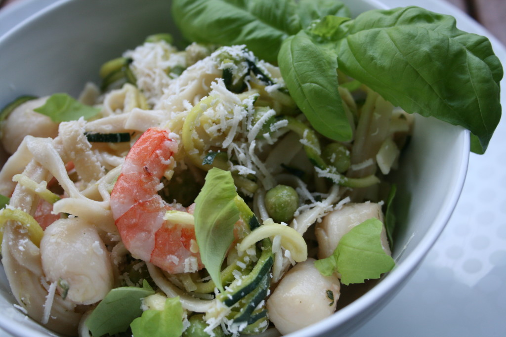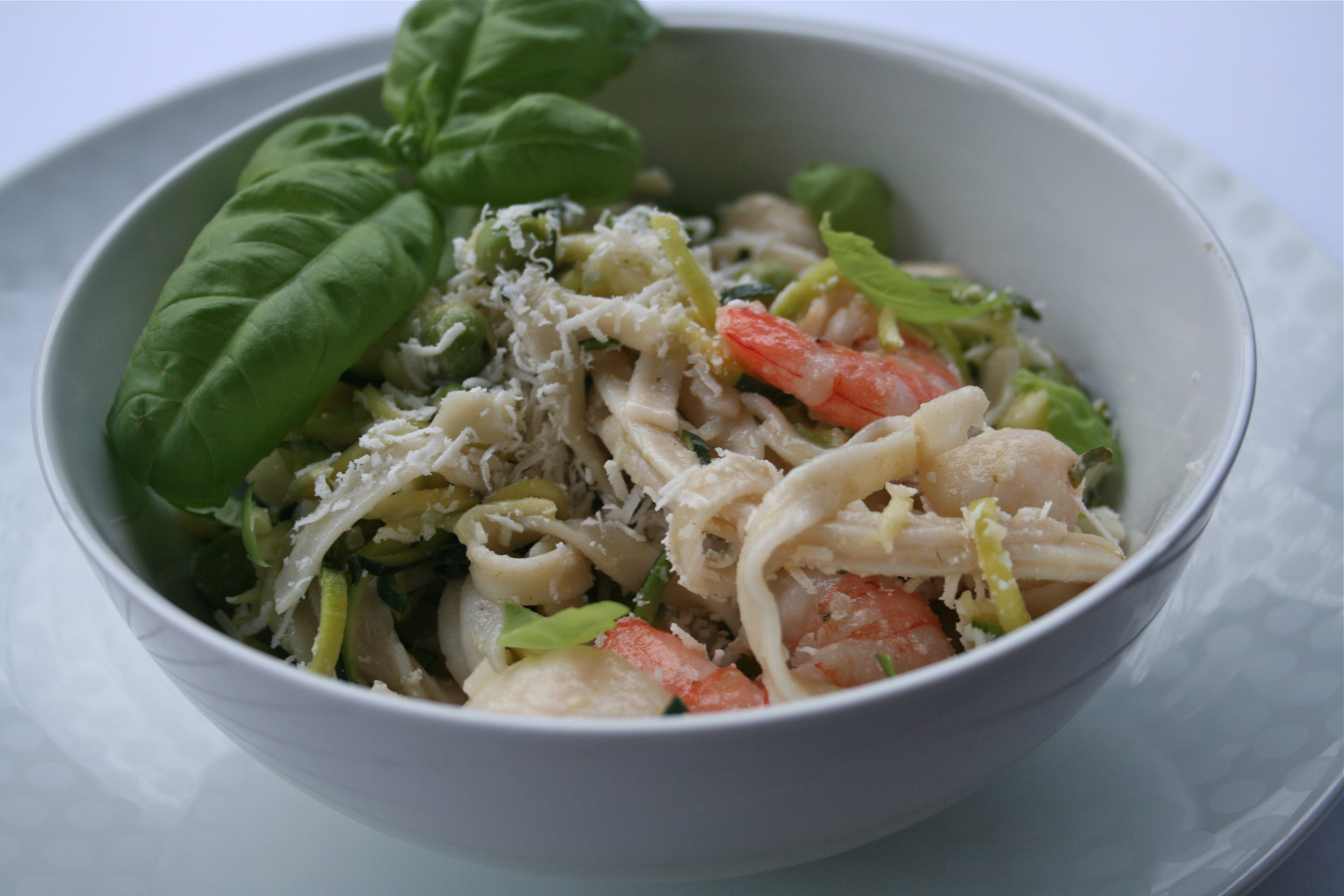 Both prawns and scallops are also rich in vitamin B12 (important for energy production), iodine (important for thyroid and consequently metabolic function), phosphorus (needed for strong bones) zinc (needed for many processes including growth, immunity, wound repair, reproduction), choline (important for the nervous system to function optimally) and protein (needed for tissue repair and growth and strong immunity).When they are fresh neither prawns nor scallops have a very strong flavor, they both have a light sweetness and delicate, buttery texture that can become rubbery if cooked too long. They pair well with the brightness of lemon, especially meyer lemons which are more subtle and sweet than regular lemons. Combined with some whole grain pasta, fresh sweet peas, fragrant basil, sharp parmesan and tender zucchini noodles they bring together a nutrient dense meal showcasing how a simple dish with good quality ingredients is better than the sum of all its parts.