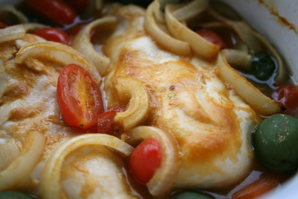 - Now prepare the chicken by placing it in a narrow baking dish, with all the other ingredients on top and around the chicken breasts. Pour the broth on and place in the oven for 40 minutes.