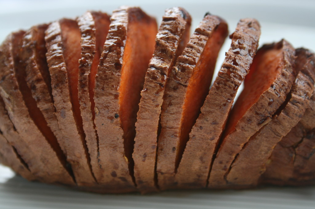 - Preheat oven to 400°. Using a very sharp paring knife make slits in the yams, around ⅛" apart and around ¾ of the way down- the base of the yam needs to stay intact so don't slice all the way. Place the yams on a parchment lined baking sheet and brush one teaspoon of the olive oil all over the top with a pastry brush (or your fingers), try and make sure some gets into the slits but don't pull them apart yet because the yams will not be very pliable when they are raw. Bake for 20 minutes, by now the separate sections should be more flexible. If any of the segments are stuck together just cut them apart carefully again. Combine the remaining olive oil with the other ingredients and brush on top and in between the slits. Bake for 45 more minutes, occasionally brushing the oil mixture that seeps out back on top if desired- kind of like basting meat. The tips of the segments should crisp up nicely like chips while the base gets dense and creamy, but if the tips start to burn cover the whole yams with a sheet of aluminum foil.