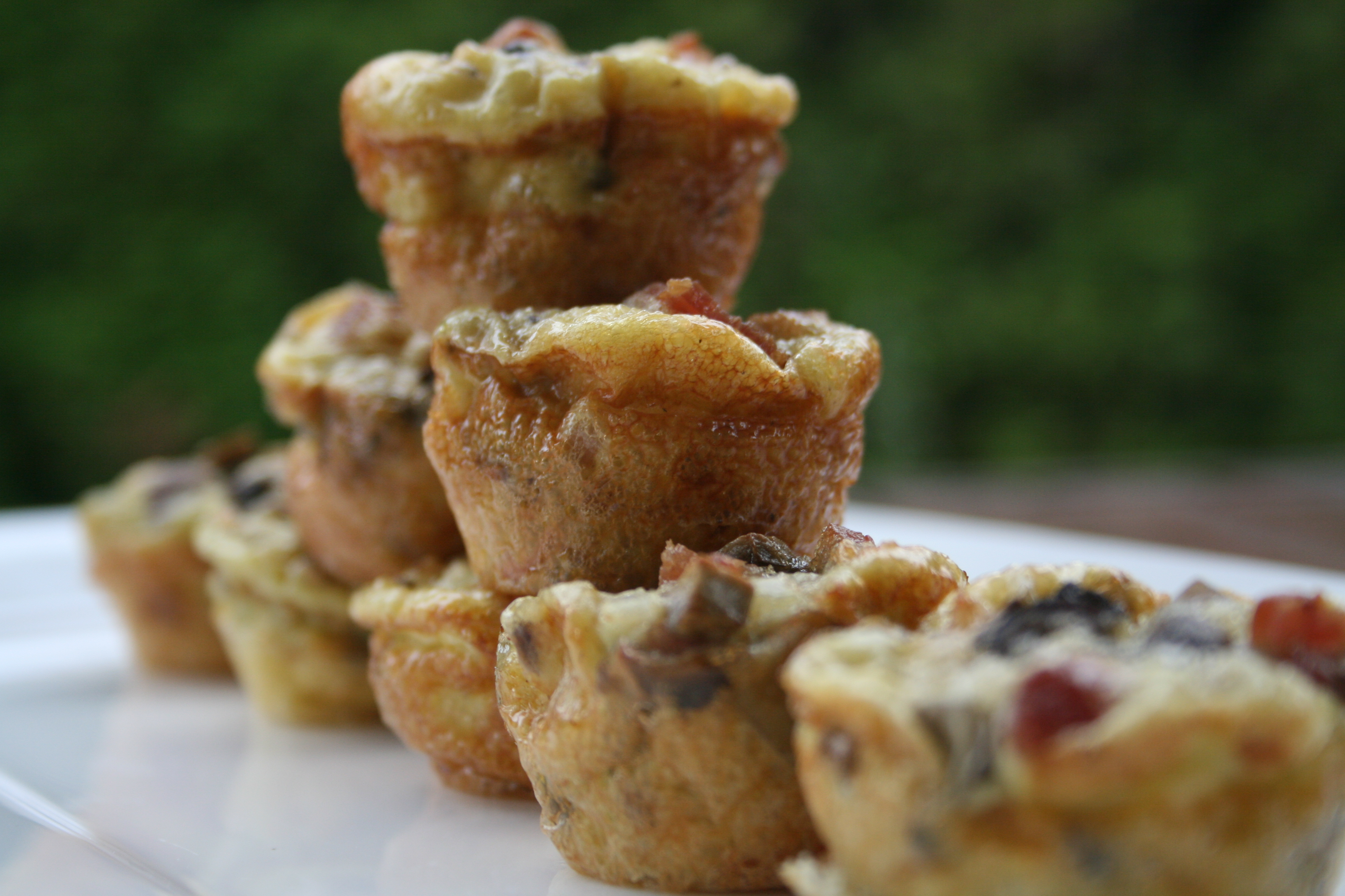 - Preheat the oven to 350°. Heat a skillet over the stove on medium high heat then drop the bacon strips into the pan, beware of flying grease. Flip with tongs after a couple minutes and remove once preferred crispiness is reached. Place the bacon on paper towel to absorb the excess grease and to cool. Strain the bacon grease from the pan and set aside 1 tablespoon to keep. Once the grease is cooled enough to handle, use it to lightly grease the insides of a mini muffin tin, this keeps the eggs from sticking to the sides. Now, whip the eggs and add in the onion, mushrooms, salt and pepper. Once the bacon is cooled enough to handle, chop it into small pieces and add to the egg mixture. Stir well and pour into the mini muffin tin, about ¾ full. Bake for 15 minutes and serve warm. The mixture can be made in advance and refrigerated until ready to cook, and once cooked the mini muffins can be refrigerated and reheated.